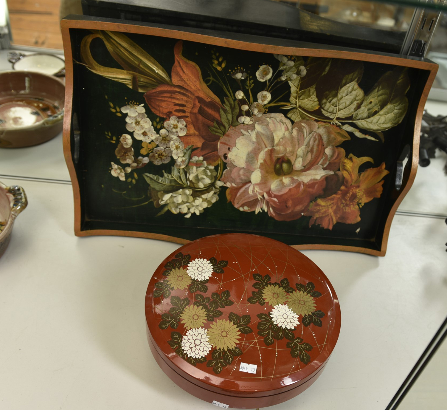 A FLORAL TRAY TOGETHER WITH LACQUERWARE BOX, LEONARD JOEL LOCAL DELIVERY SIZE: SMALL