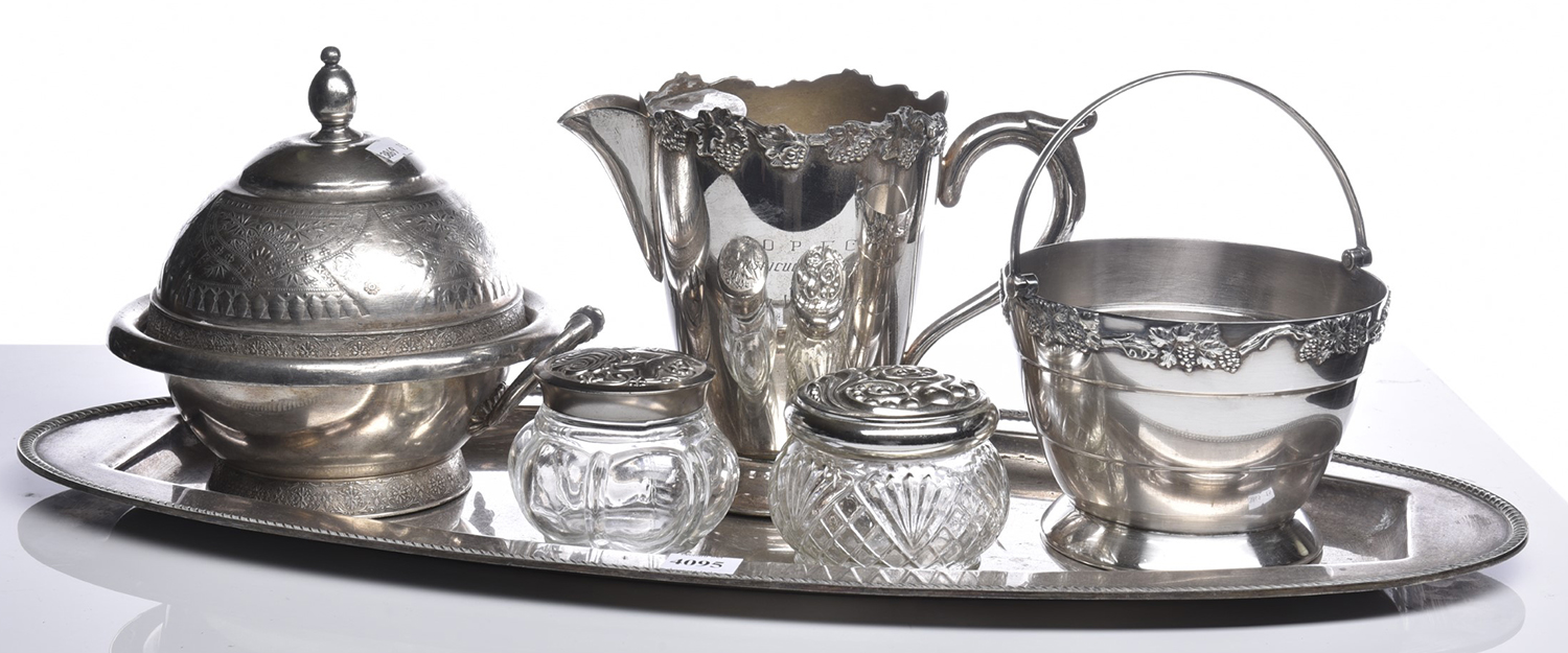 A GROUP OF SILVERPLATE ITEMS ON TRAY, LEONARD JOEL LOCAL DELIVERY SIZE: SMALL