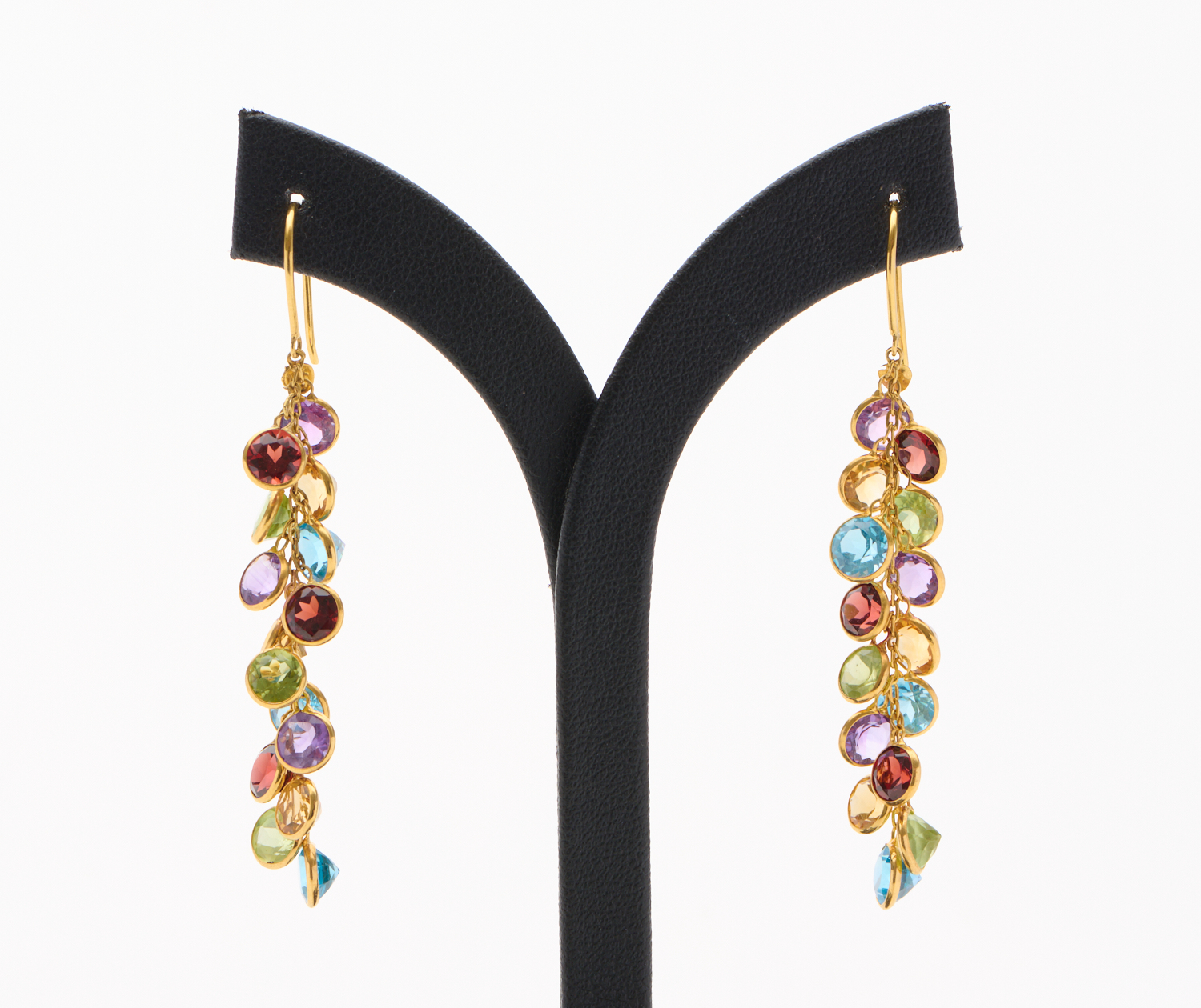 A PAIR OF BURMESE GEMSTONES DROP EARRINGS IN 18CT GOLD, COMPRISING AMETHYST, AQUAMARINE, PERIDOT, CITRINE AND GARNET, TO SHEPHERD HOOK FITTINGS, LENGTH 6CMS