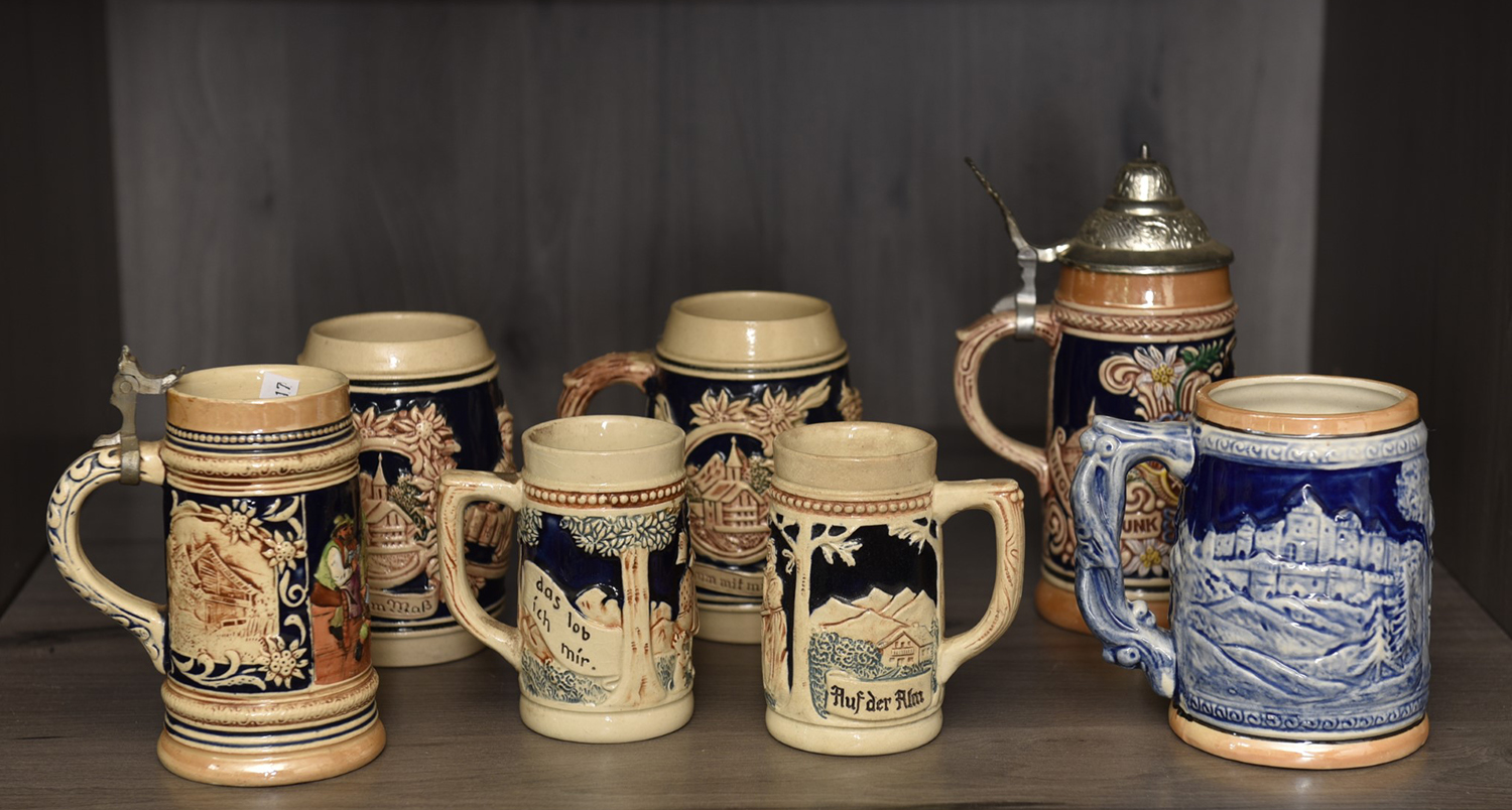A SHELF OF GERMAN CERAMIC TANKARDS, LEONARD JOEL LOCAL DELIVERY SIZE: SMALL