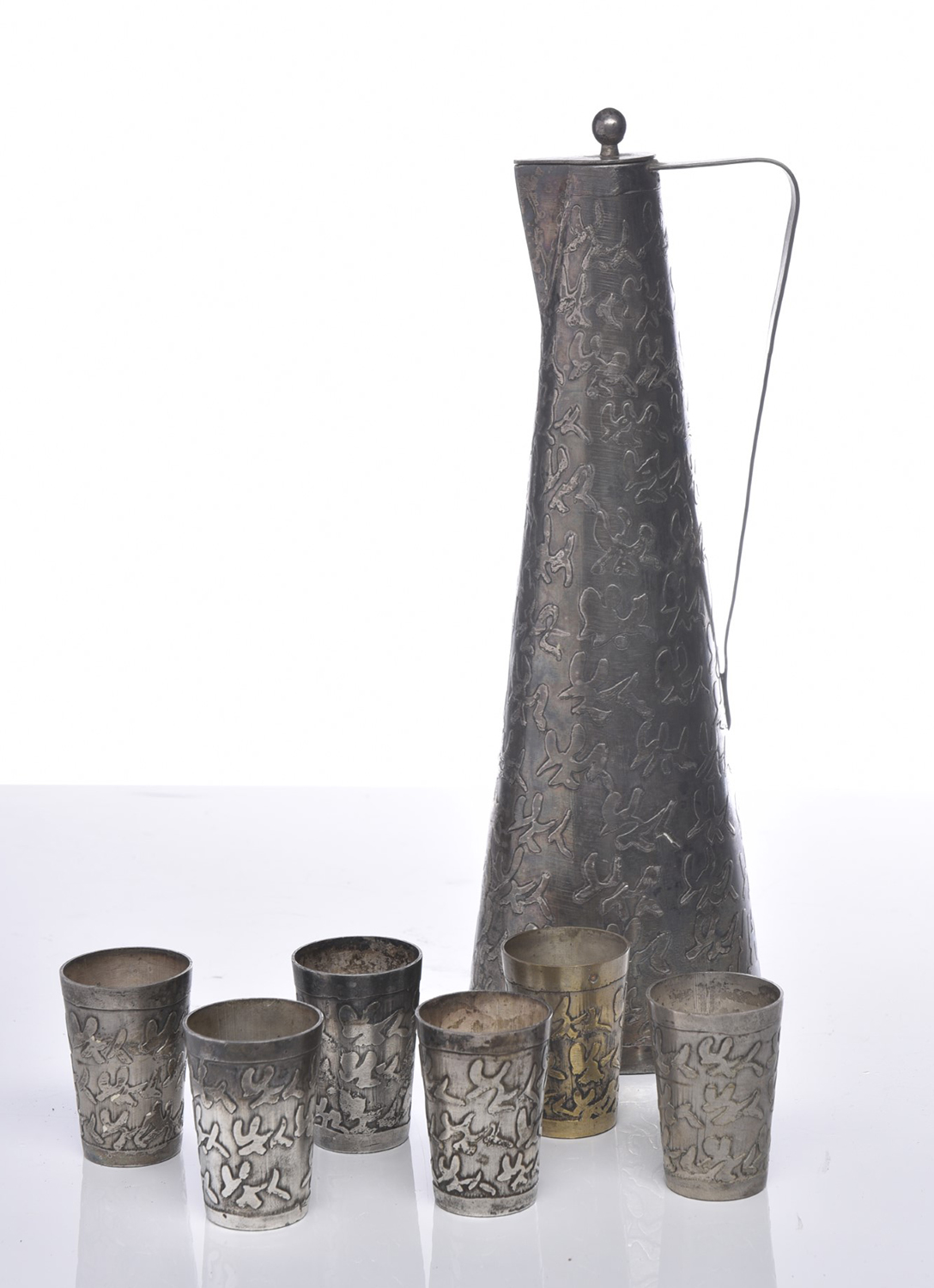 A MID-CENTURY MIXED METAL LIQUEUR SET BY POLISH SCULPTOR AND METALWORKER ADAM SZUBSKU, EACH PIECE FULLY SIGNED (25 CM H), LEONARD JOEL LOCAL DELIVERY SIZE: SMALL