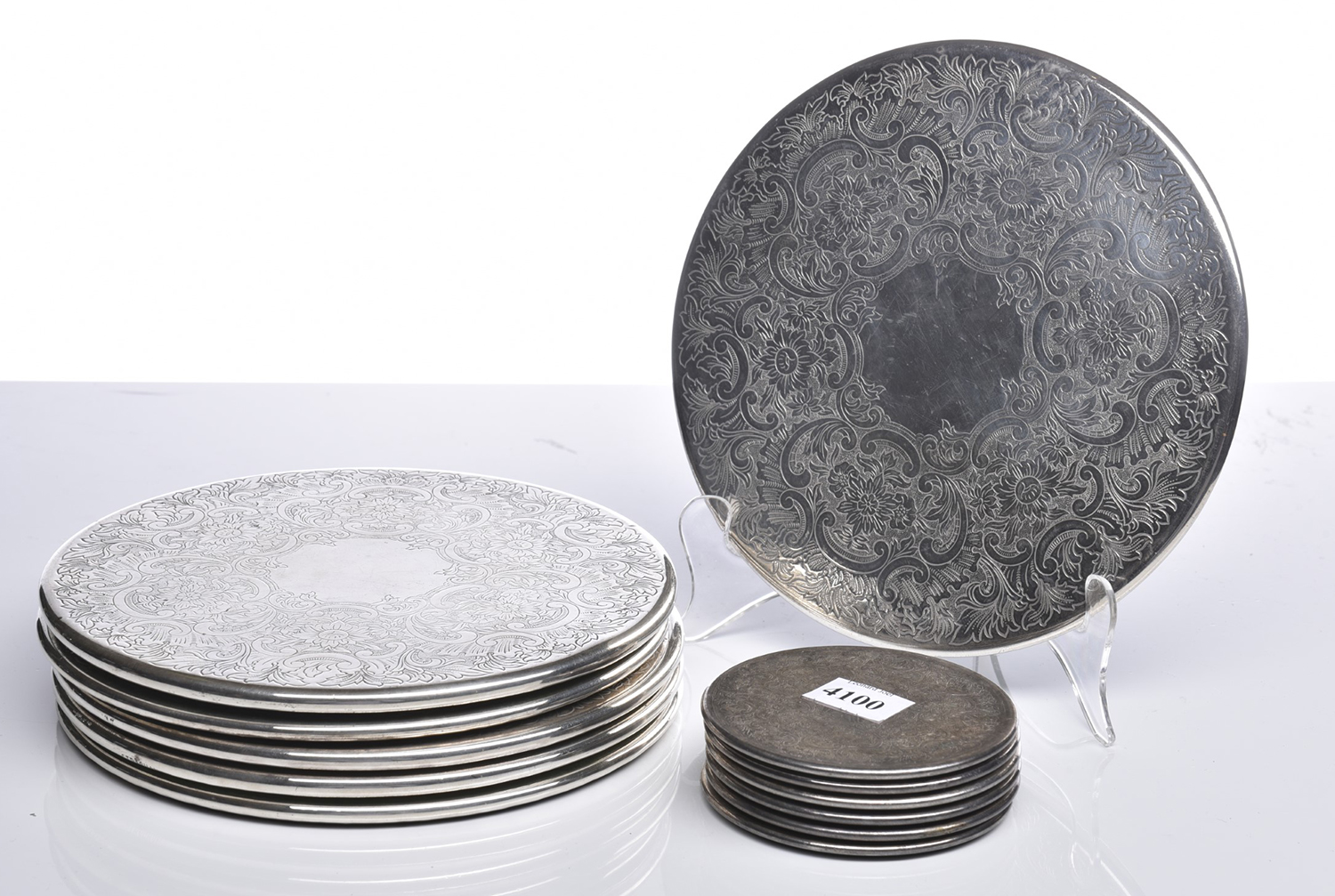 SIX STRACHAN SILVERPLATED TABLE COASTERS AND SIX DRINK COASTERS (18 CM D), LEONARD JOEL LOCAL DELIVERY SIZE: SMALL