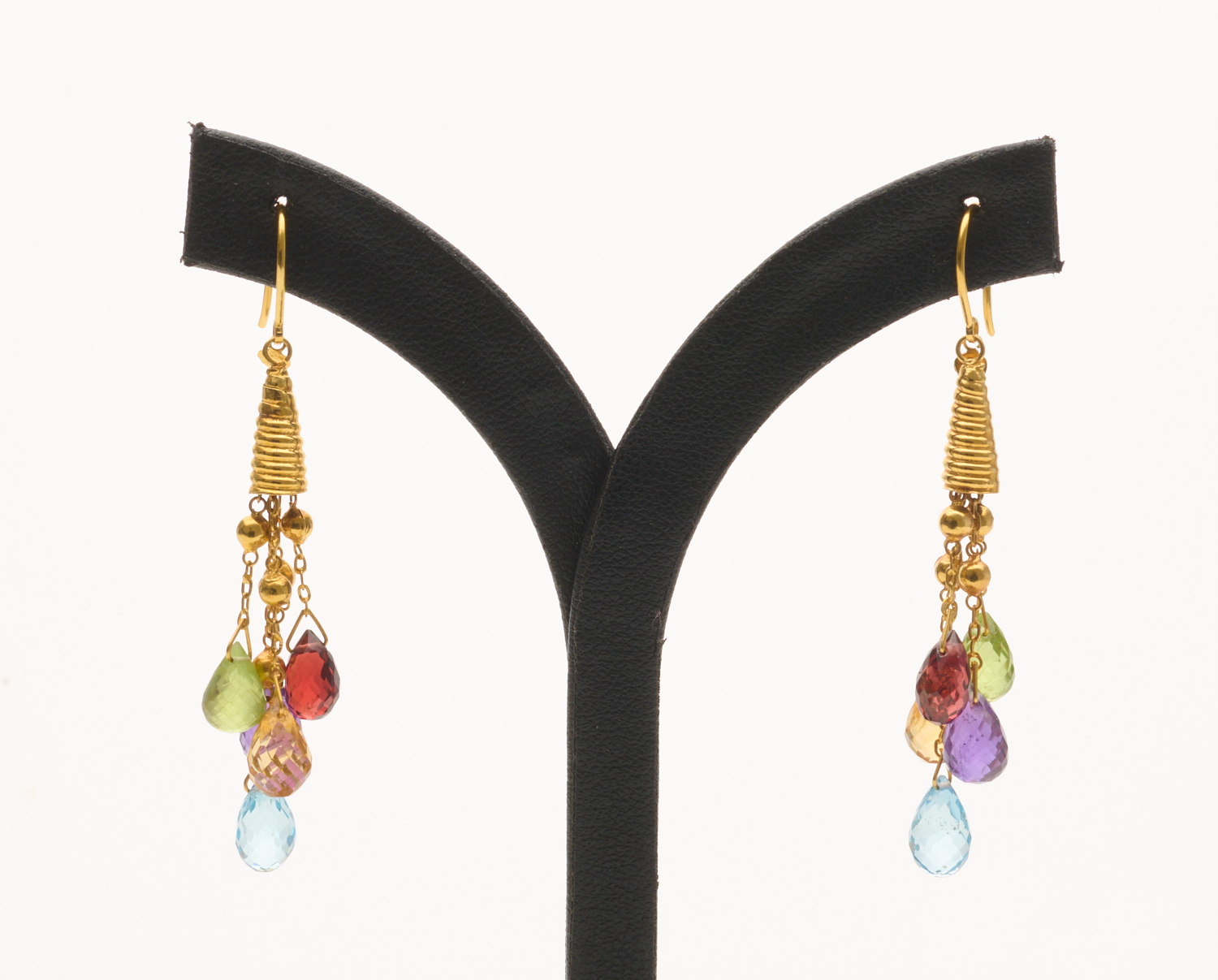 A PAIR OF BURMESE GEMSTONE DROP EARRINGS IN 18CT GOLD, COMPRISING AQUAMARINE, PERIDOT, AMETHYST, CITRINE AND GARNET, TO SHEPHERD HOOK FITTINGS, LENGTH 6CMS