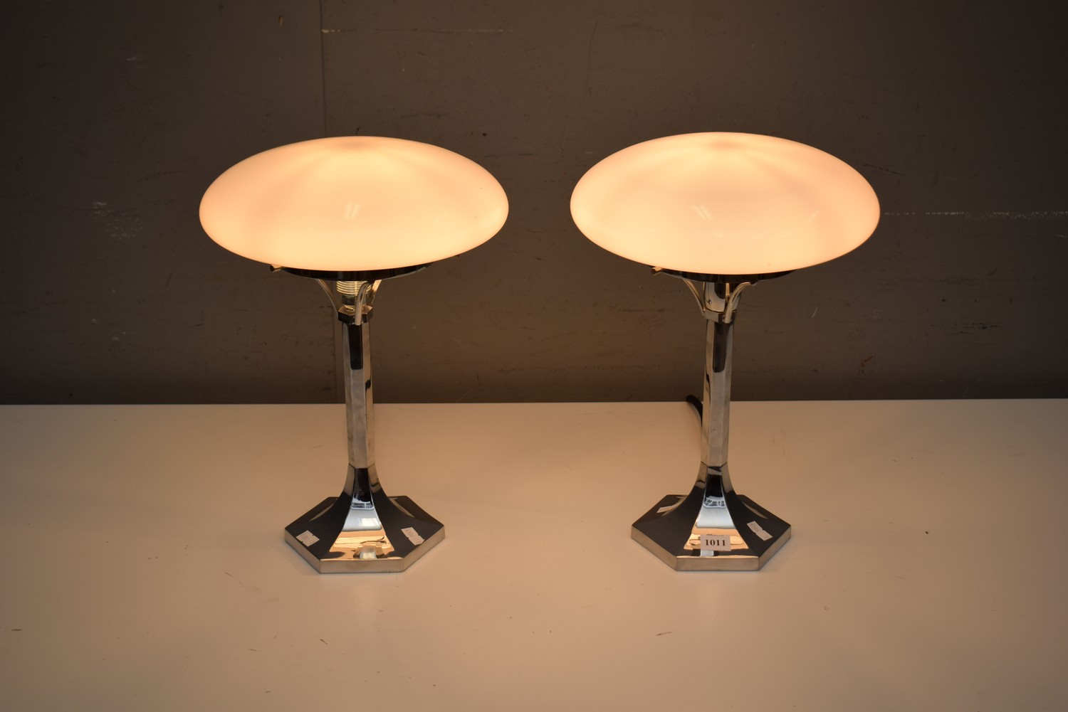 A PAIR OF ART DECO STYLE TABLE LAMPS WITH CHROME FRAMES A/F(34H x 26D CM) (LEONARD JOEL DELIVERY SIZE: MEDIUM)