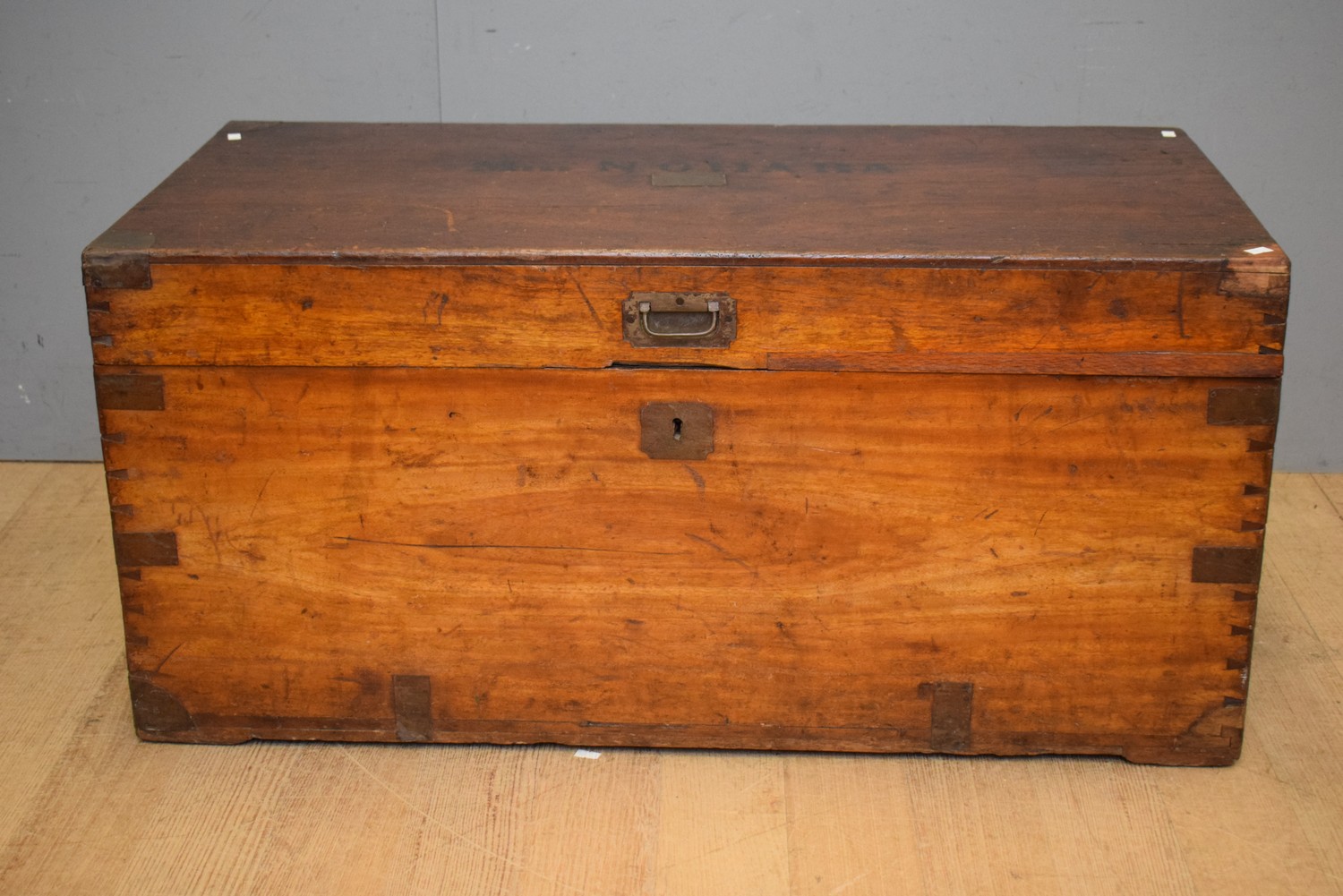 A 19TH CENTURY FLIP TOP TRUNK WITH DOVE TAIL JOINERY (46H X 98W X 48D CM) (LEONARD JOEL DELIVERY SIZE: MEDIUM)