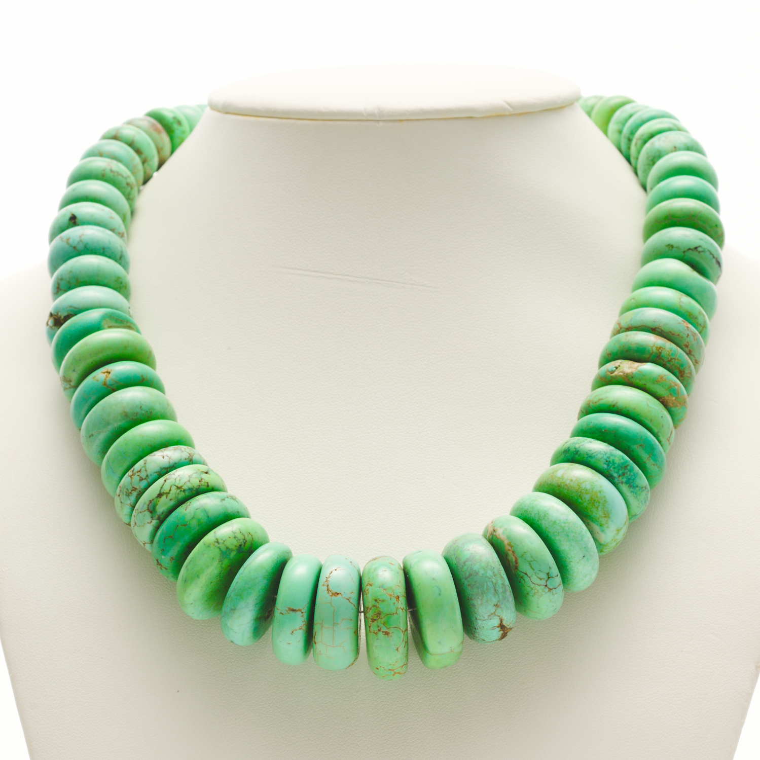 A LARGE TURQUOISE FLAT BEAD NECKLACE, CLASP A/F, LENGTH 48CMS