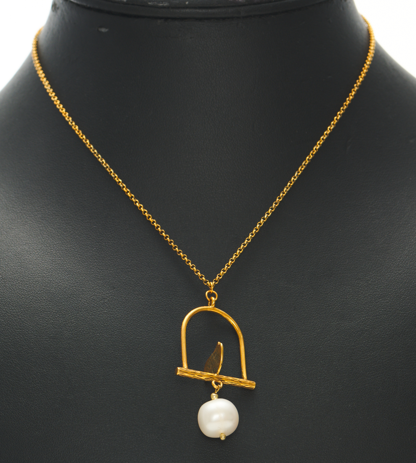 A PAIR OF EMERALD EARRINGS FEATURING A PERCHED BIRD IN GILT, TOGETHER WITH A MATCHING NECKLACE COMPRISING A FAUX PEARL, EARRING LENGTH APPROXIMATELY 5CM, TOTAL NECKLACE LENGTH 46CM