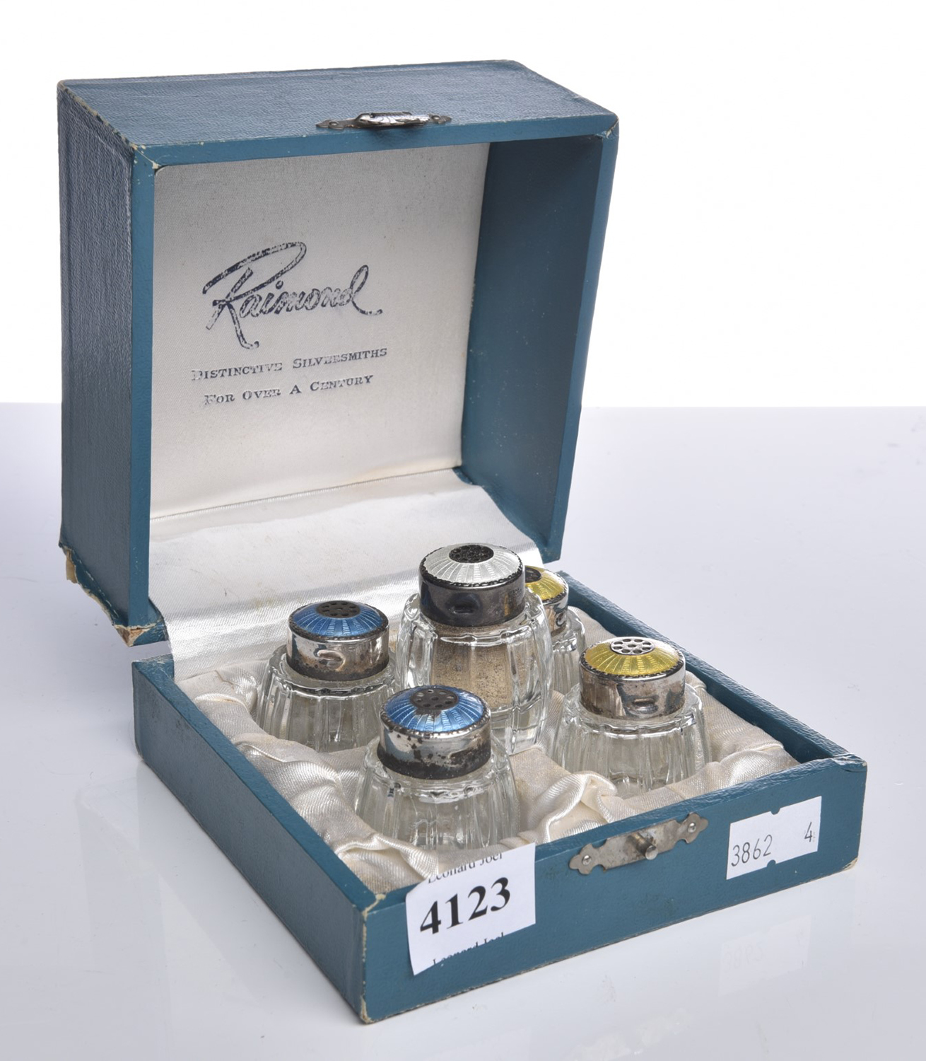 A NORWEGIAN SILVER AND ENAMEL CRUET SET IN CASE, LEONARD JOEL LOCAL DELIVERY SIZE: SMALL