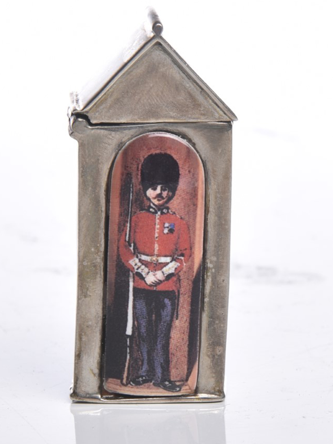 A STERLING SILVER VESTA WITH QUEEN'S GUARD DECORATION, LEONARD JOEL LOCAL DELIVERY SIZE: SMALL