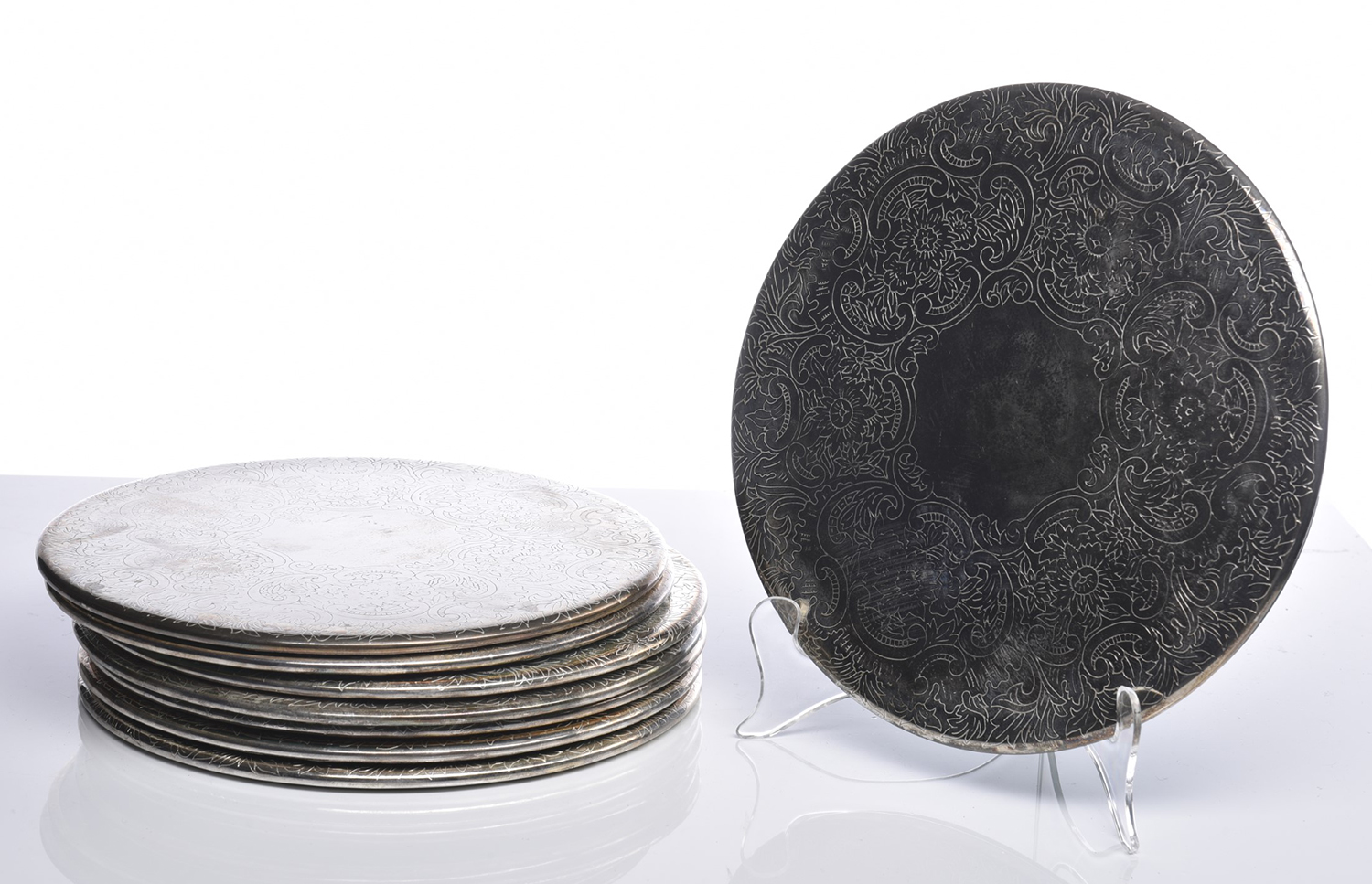 A SET OF EIGHT SILVERPLATED COASTERS DIA.20CM, LEONARD JOEL LOCAL DELIVERY SIZE: SMALL