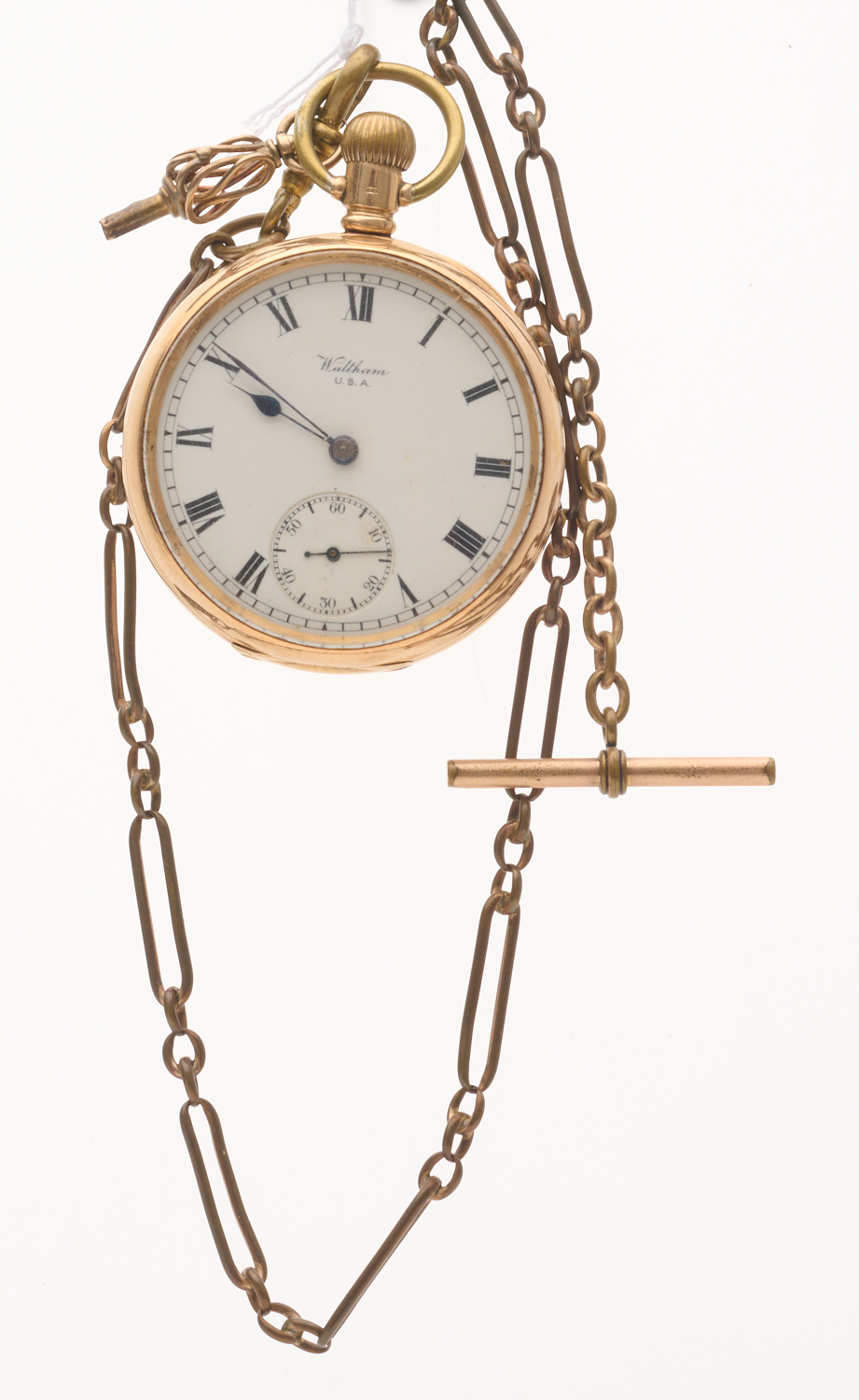 A WALTHAM POCKET WATCH IN 15CT GOLD, WITH GOLD PLATED KEY AND WATCH CHAIN A/F