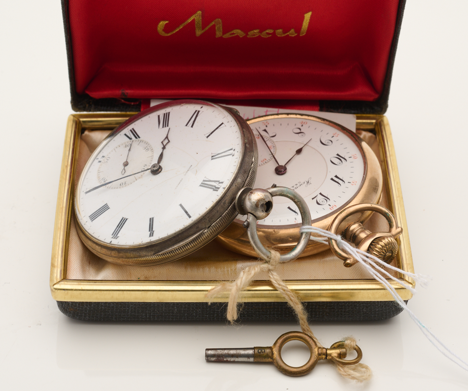 TWO POCKET WATCHES INCLUDING GOLD PLATED ''HOWARD'' AND ''MURET'' KEY WIND, BOTH A/F