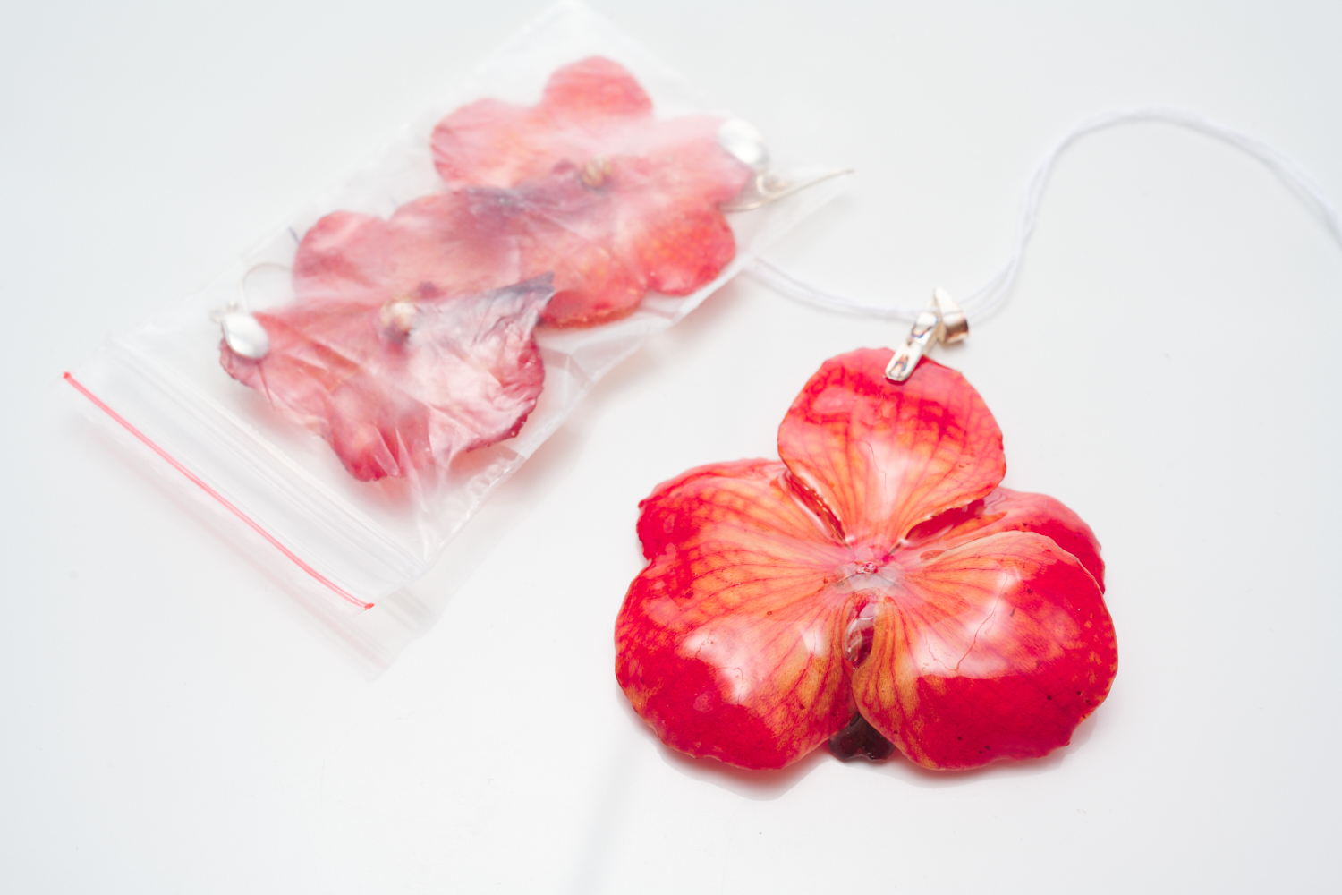 A STERLING SILVER PENDANT, ENAMEL ORCHID DESIGN WITH MATCHING PAIR OF EARRINGS