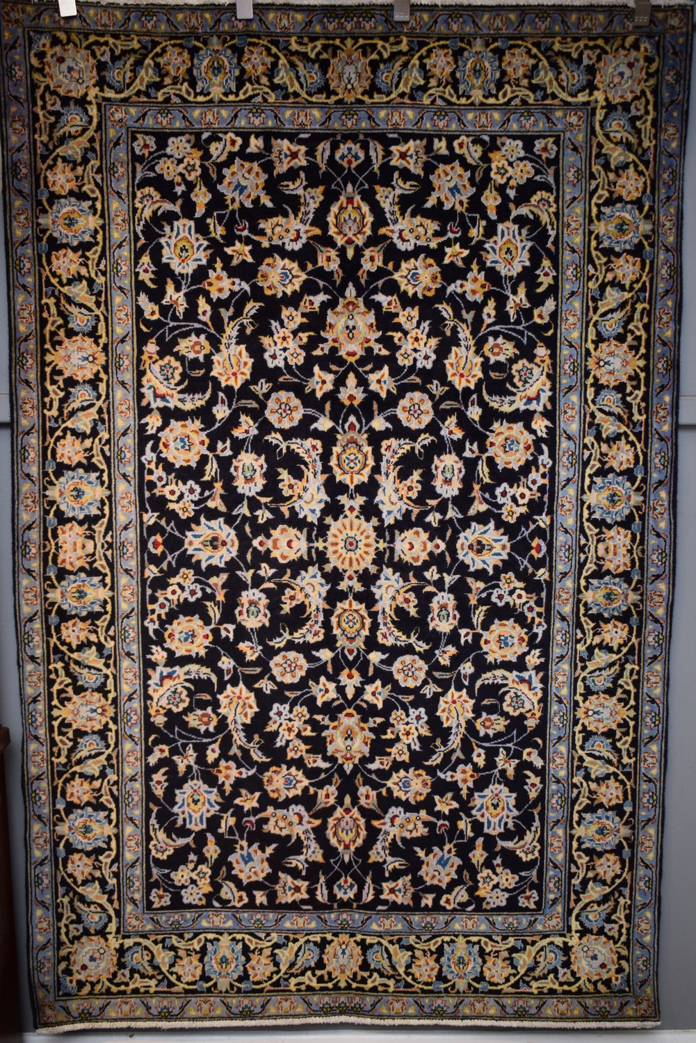 AN ORIGINAL PERSIAN ROYAL KASHAN CARPET. 100% WOOL PILE. FINELY HAND-KNOTTED WEAVE. CLASSIC KASHAN DESIGN OF ALL-OVER 16TH CENTURY SHAH ABBASSI PALMETTES, FLORAL MOTIFS & SAZ LEAVES IN A ROYAL BLUE FIELD. MAJOR BORDER OF PALMETTES, FLORAL MOTIFS & SAZ LEAVES. MINOR BORDERS OF PALMETTES & TENDRILS. CERTIFICATE OF AUTHENTICITY INCLUDED. SIZE: 222X145CM ORIGIN: PERSIA - RRP: $3900