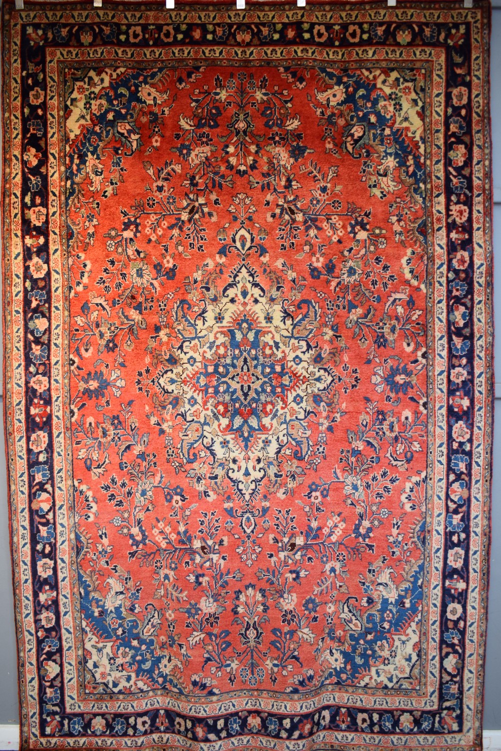 A MEHRABAN RUG, 100% WOOL PILE. STURDY & HARD-WEARING. HAND-KNOTTED CITY WEAVE WITH TRADITIONAL DESIGN OF CENTRAL BOLD FLORAL MEDALLION AND QUARTERED CORNER MEDALLIONS WITH PAISLEY MOTIFS & BOLD FLORAL SPRAYS IN A RED BACKGROUND. BORDER OF FLORAL MOTIFS. CERTIFCATE OF AUTHENTICITY INCLUDED. SIZE: 313X206CM ORIGIN: PERSIA - RRP: $4,400