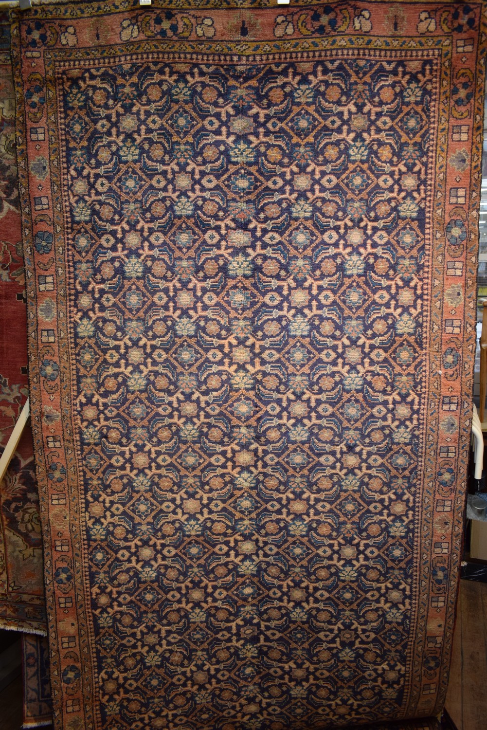 A PERSIAN MALAYER HALL RUNNER. 100% WOOL. HAND KNOTTED VILLAGE WEAVE FROM THE HAMADAN PROVINCE WITH DESIGN OF ALL OVER BOLD FLORAL HERAI MAHI PATTERNS IN A NAVY-BLUE BACKGROUND. BORDER OF ROSETTES AND LEAF FORMS. CERTIFCATE OF AUTHENTICITY INCLUDED. SIZE: 330X138CM ORIGIN: PERSIA - RRP: $2,600