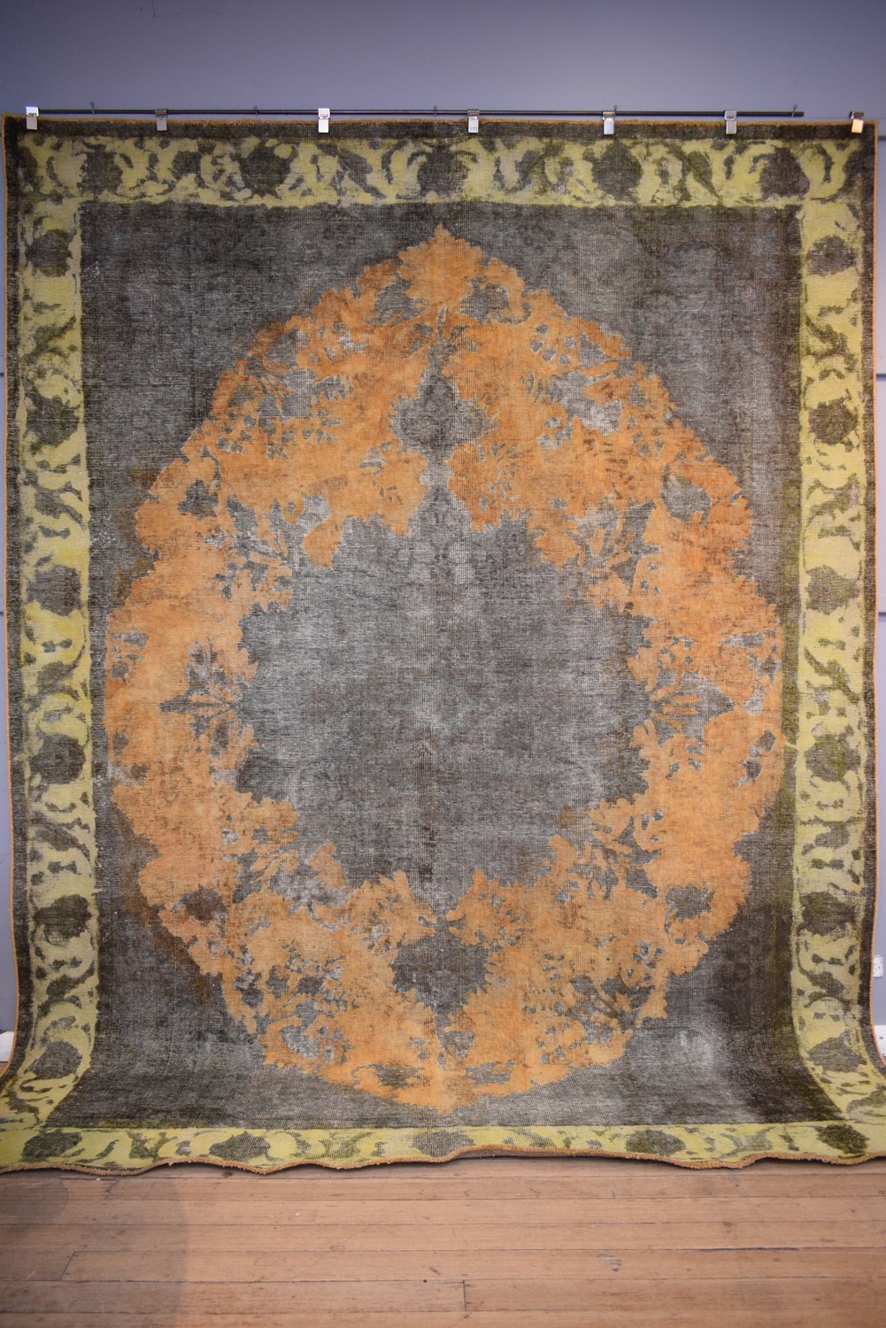 A CONTEMPORARY VINTAGE OVER-DYED PERSIAN TABRIZ CARPET. VINTAGE PILE. A UNIQUE & INDIVIDUAL MODERN CARPET CREATED FROM AN AUTHENTIC FINELY HAND-KNOTTED VINTAGE PERSIAN TABRIZ CARPET WITH CLASSIC MEDALLION DESIGN. THE PILE IS SHORN AND THE ENTIRE IS OVER-DYED IN CHARCOAL, RUST AND LIME GREEN. CERTIFICATE OF AUTHENTICITY INCLUDED. SIZE: 390X295CM ORIGIN: PERSIA - RRP: $6,900