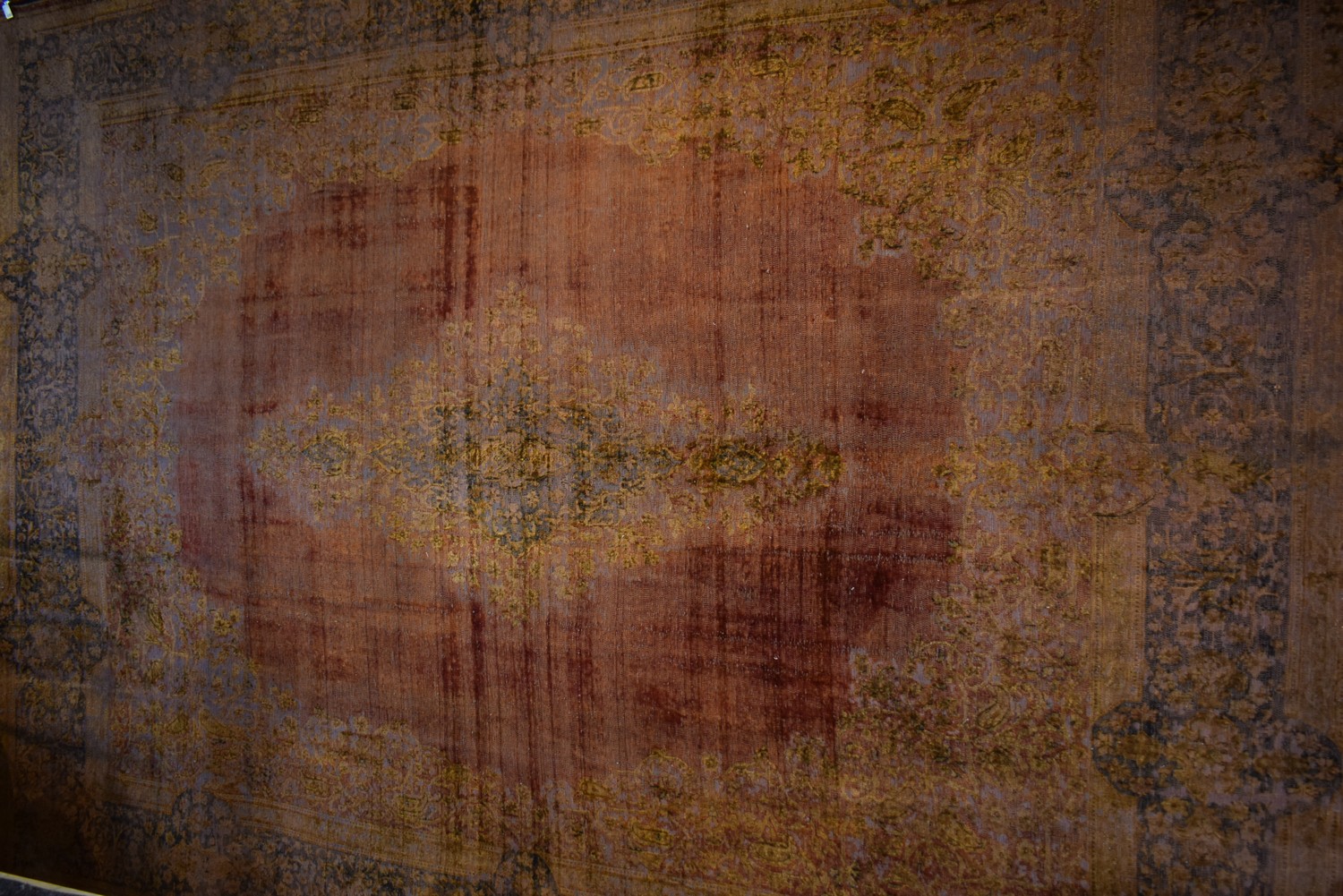 AN EXCEPTIONAL MODERN VINTAGE OVER-DYED PERSIAN KERMAN CARPET, VINTAGE PILE. A ONE-OF-A-KIND MODERN CARPET CREATED FROM AN AUTHENTIC VINTAGE MEDALLION DESIGN KERMAN CARPET WITH THE PILE SHORN. THE ENTIRE IS OVER-DYED IN LIGHT BLUE, GOLD & RUST TONES. CERTIFCATE OF AUTHENTICITY INCLUDED. SIZE: 404X298CM ORIGIN: PERSIA - RRP: $9,900