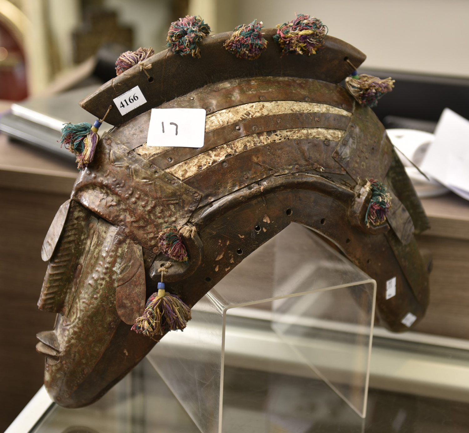 A JANIFORM AFRICAN HELMET MASK WITH APPLIED METAL AND TASSELS W.43CM, LEONARD JOEL LOCAL DELIVERY SIZE: SMALL
