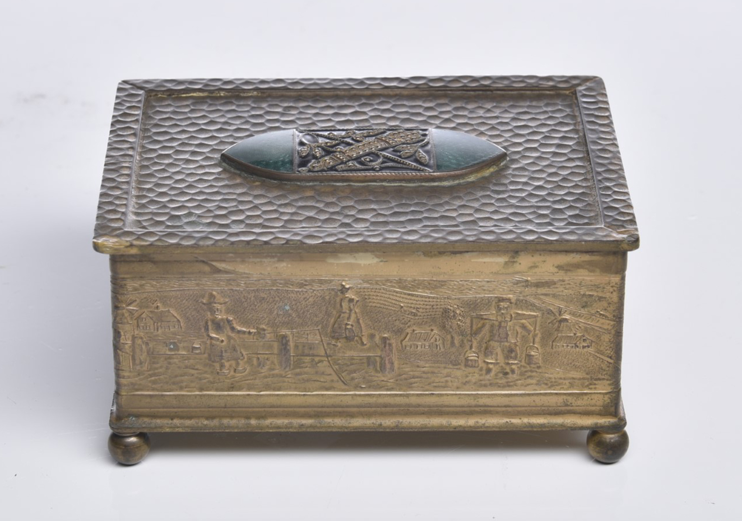 A HAMMERED BRASS BOX WITH ENAMEL GUILLOCHE DECORATION TO LID, LEONARD JOEL LOCAL DELIVERY SIZE: SMALL