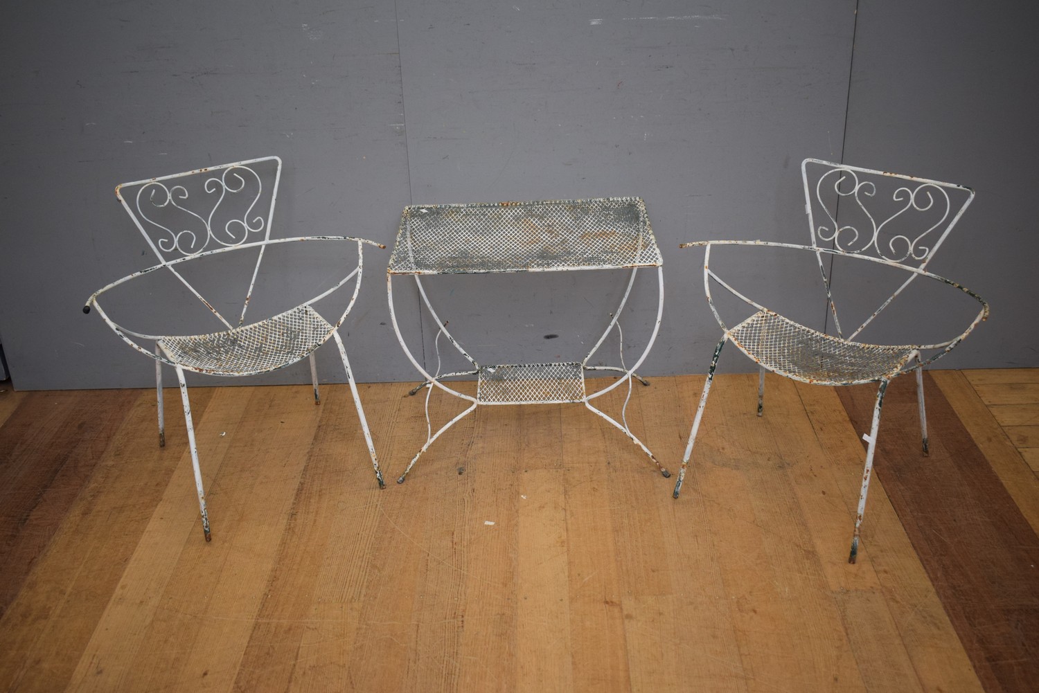 A FINE RETRO 1950S METAL SAUCER FORM 3 PIECE OUTDOOR TABLE AND CHAIRS (A/F) (H55 X W66 X D47 CM) (LEONARD JOEL DELIVERY SIZE: LARGE)