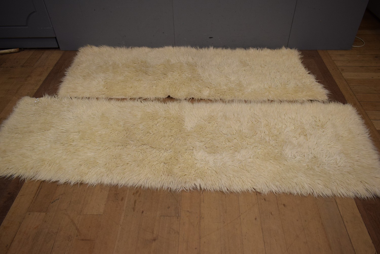 TWO RETRO WHITE FLOCARTI RUGS (LARGEST - 250 X 80, SMALLEST - 215 X 80 CM) (LEONARD JOEL DELIVERY SIZE: MEDIUM)
