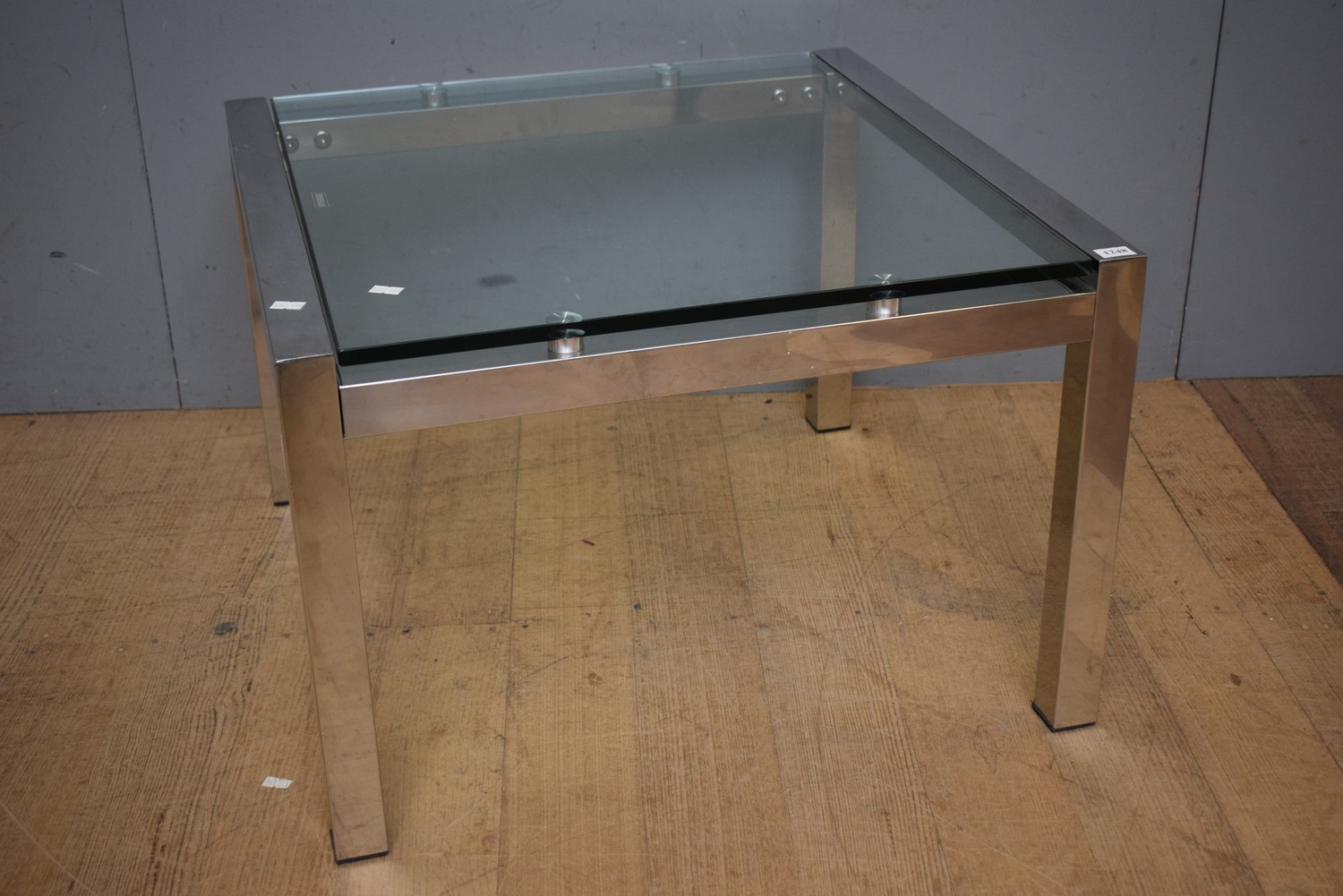 A 1970S CHROME AND TEMPERED GLASS TOPPED COFFEE TABLE (40H X 60W X 60D CM) (LEONARD JOEL DELIVERY SIZE: MEDIUM)