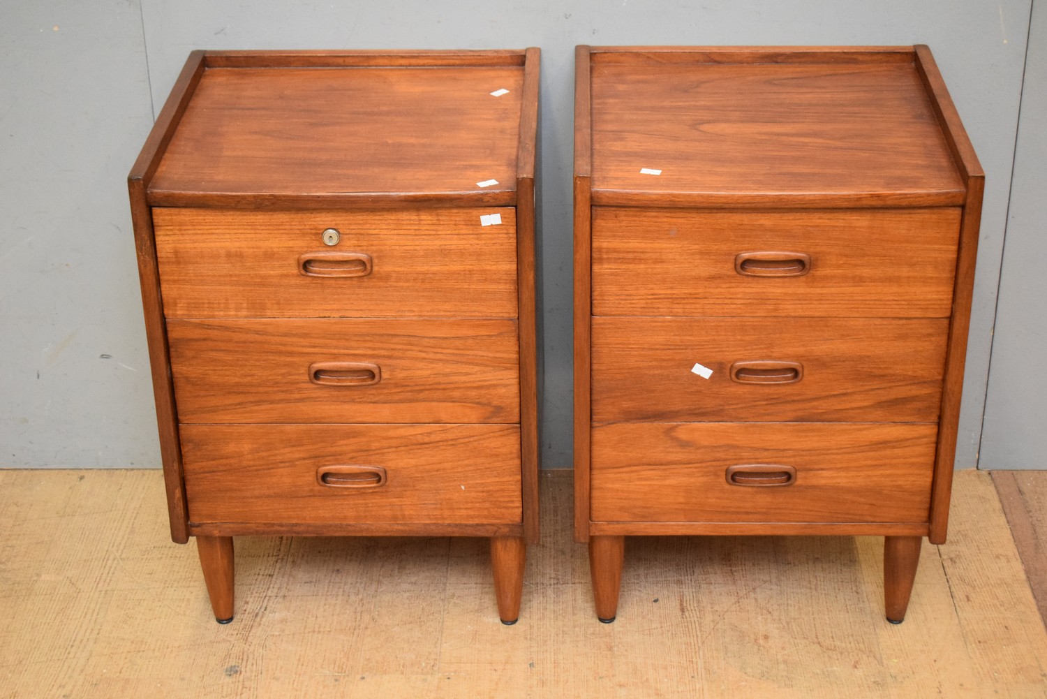 A PAIR OF 1960S AUSTRALIAN SOLID TEAK RETRO THREE DRAWER BEDSIDE CABINETS (LEONARD JOEL DELIVERY SIZE: MEDIUM) (63H X 44W X 41D CM)