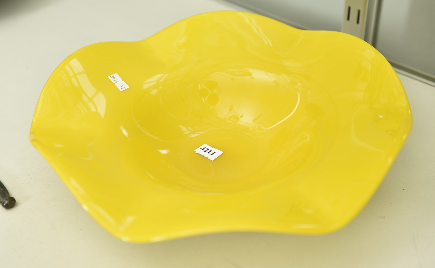 A VINTAGE SWEDISH YELLOW AND WHITE CASED GLASS BOWL WITH RUFFLE EDGE DIA.34CM, LEONARD JOEL LOCAL DELIVERY SIZE: SMALL