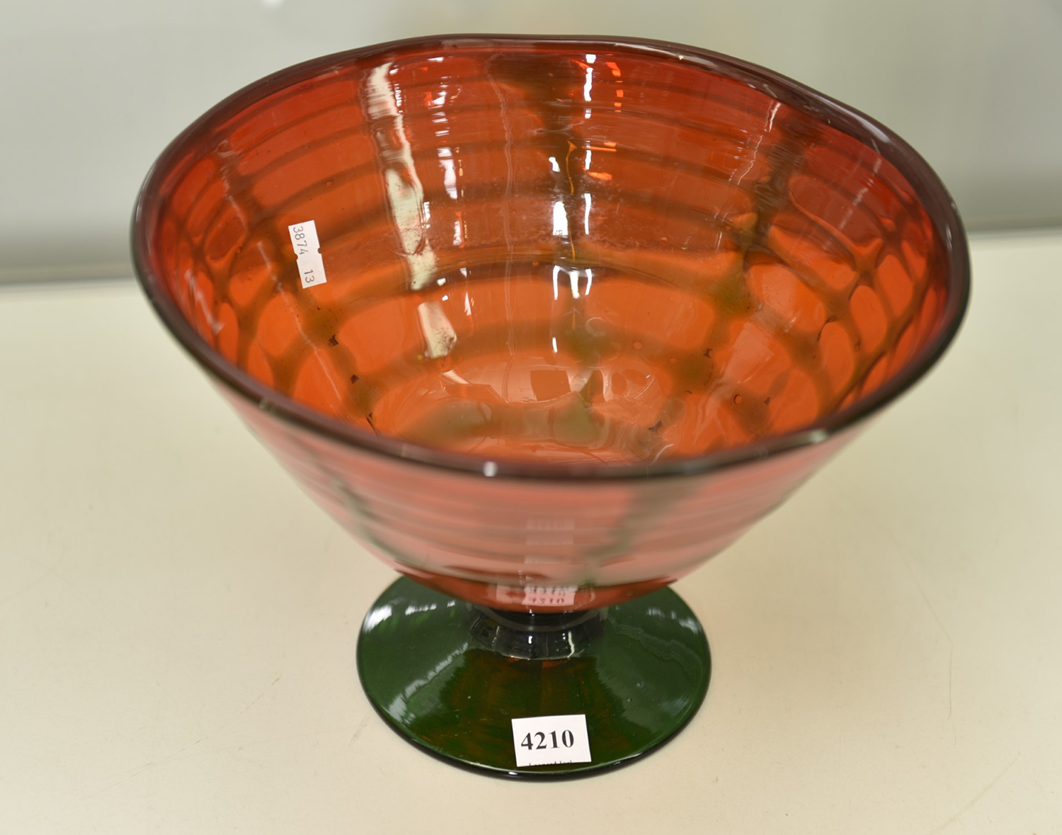 A SIGNED AUSTRALIAN RETRO HAND BLOWN ART GLASS BOWL IN ORANGE AND GREEN TONES WITH ORIGINAL STICKER DIA.26CM, LEONARD JOEL LOCAL DELIVERY SIZE: SMALL
