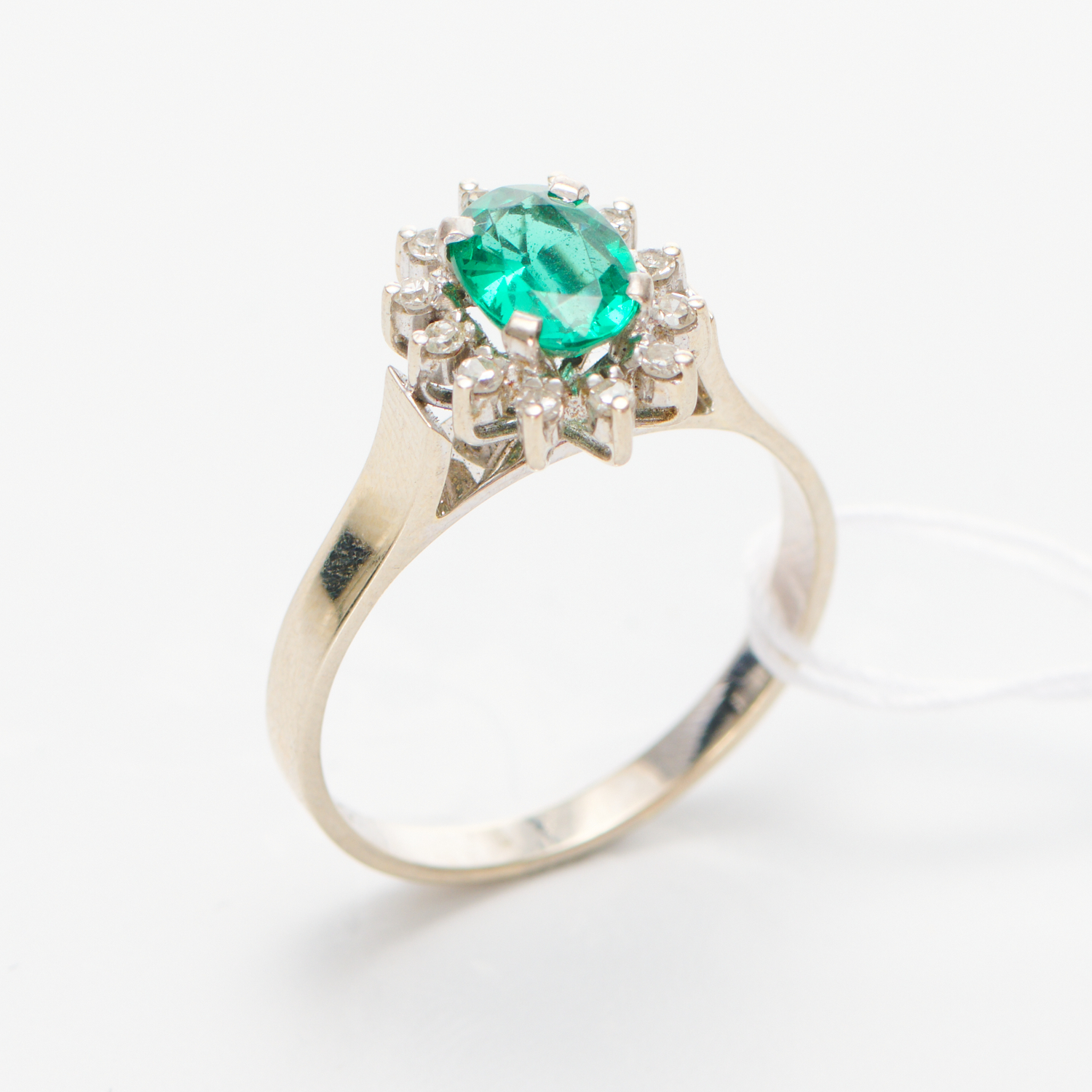 A SYNTHETIC EMERALD AND DIAMOND CLUSTER RING IN 18CT WHITE GOLD, SIZE R, 4.3GMS