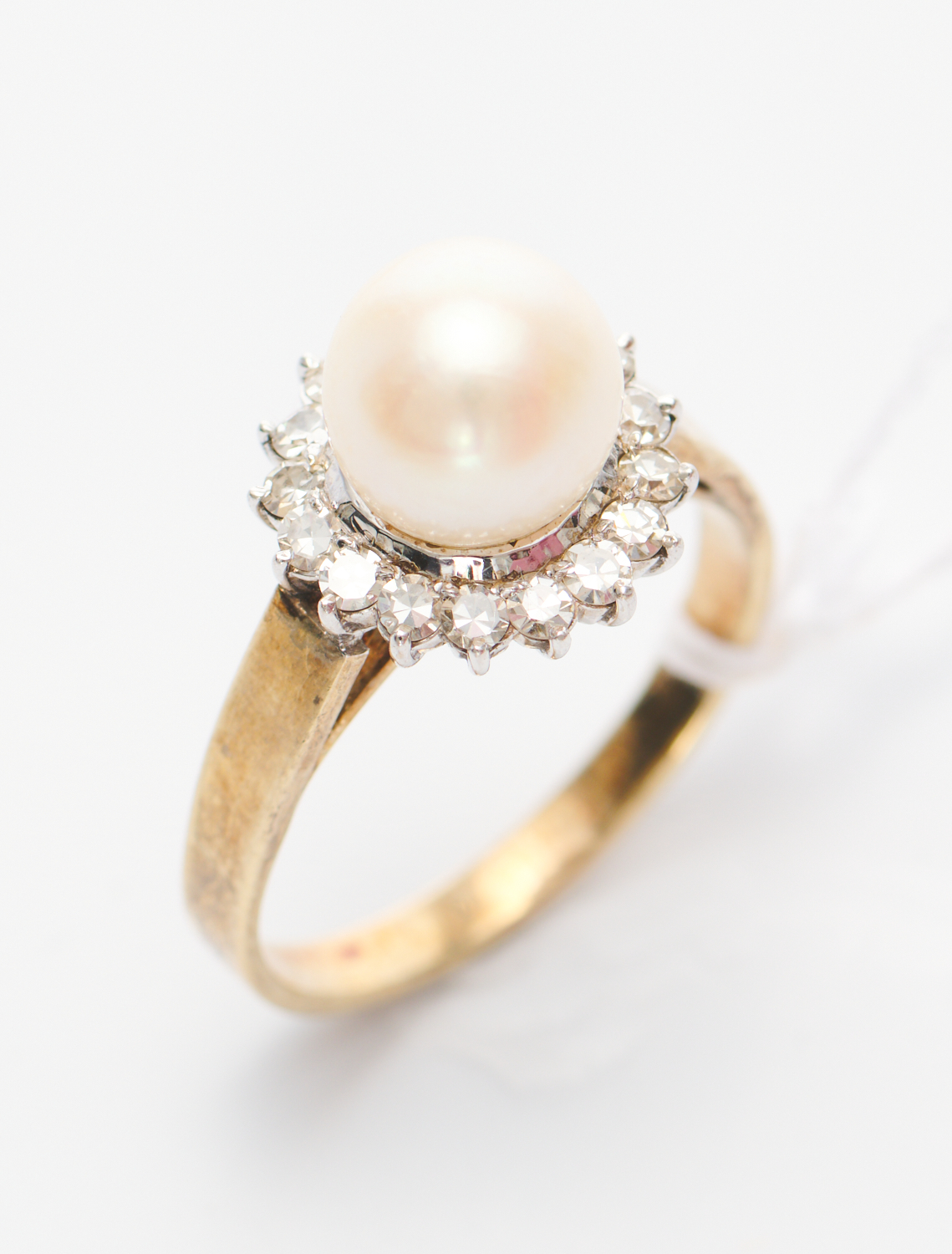 A CULTURED PEARL AND DIAMOND CLUSTER RING IN 9CT GOLD, SIZE Q, 4.8GMS