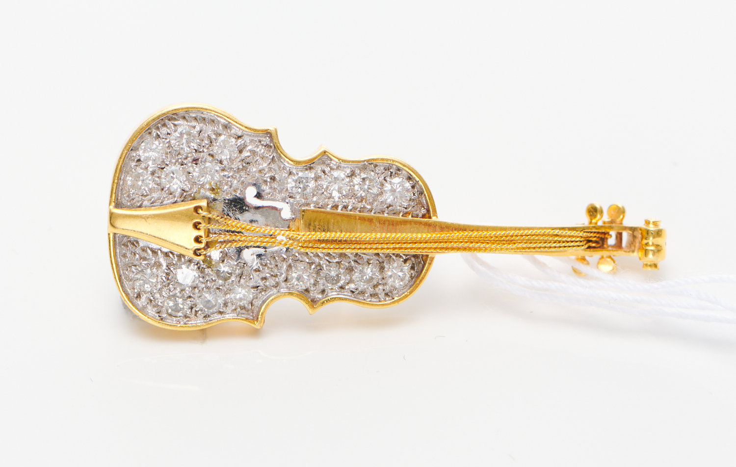 A DIAMOND VIOLIN PENDANT IN TWO TONE 18CT GOLD, LENGTH 40MM, 6.3GMS