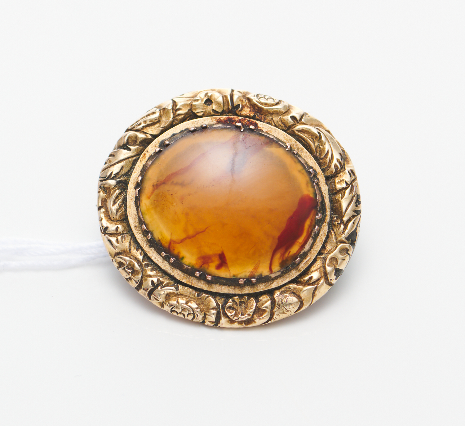 AN ANTIQUE AGATE SET BROOCH IN 9CT GOLD FRAME, LENGTH 22MM, 5.5GMS