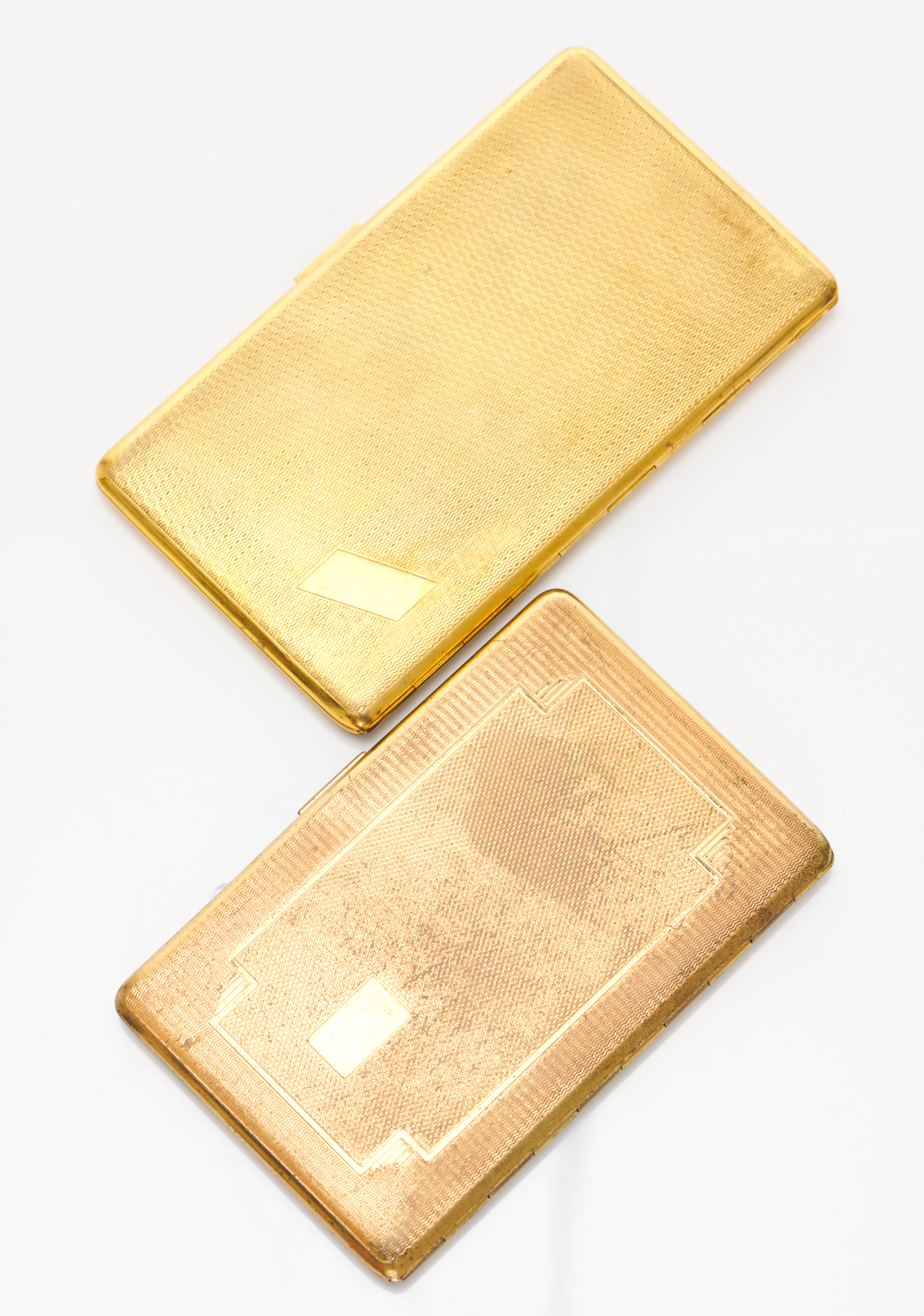 TWO ENGLISH CIGARETTE CASES IN GILT, THE LARGER ONE MEASURING 14x8CM