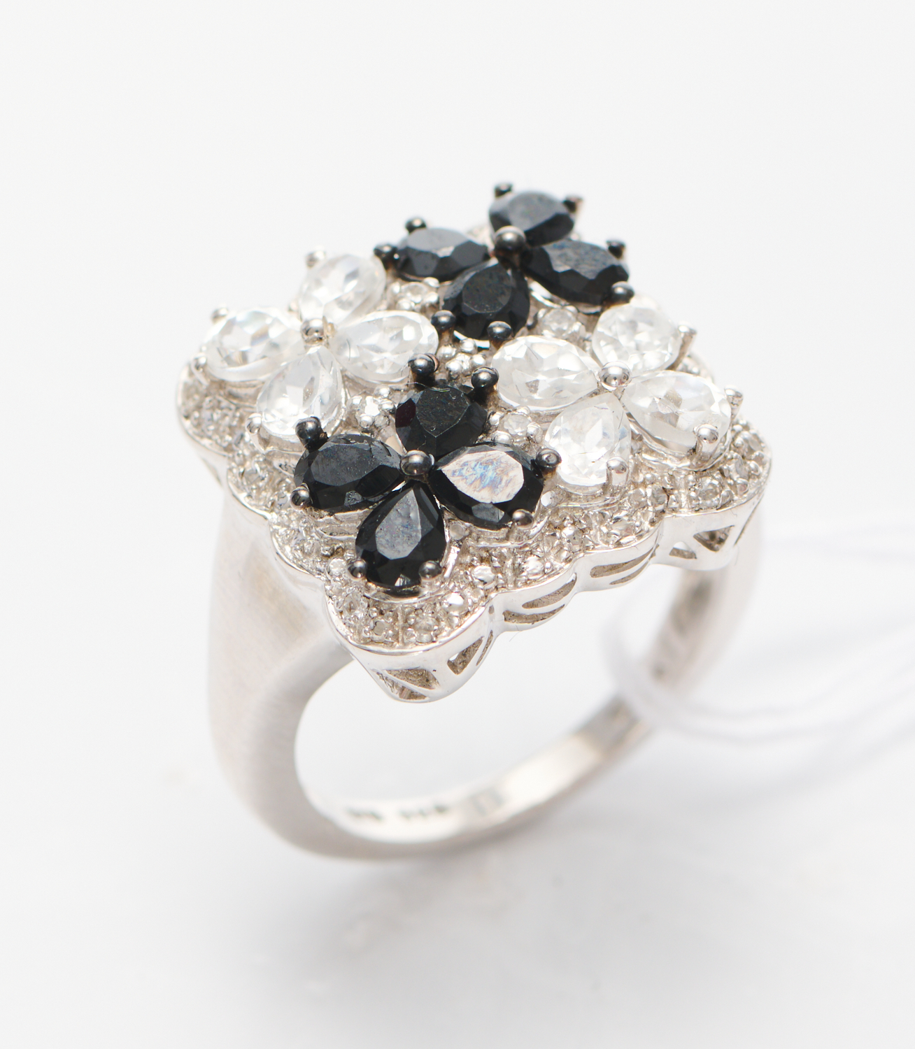 A BLACK SPINEL AND WHITE TOPAZ RING IN SILVER, THE SPINEL TOTALLING APPROXIMATELY 1.36CTS AND THE TOPAZ APPROXIMATELY 1.44CTS, SIZE N