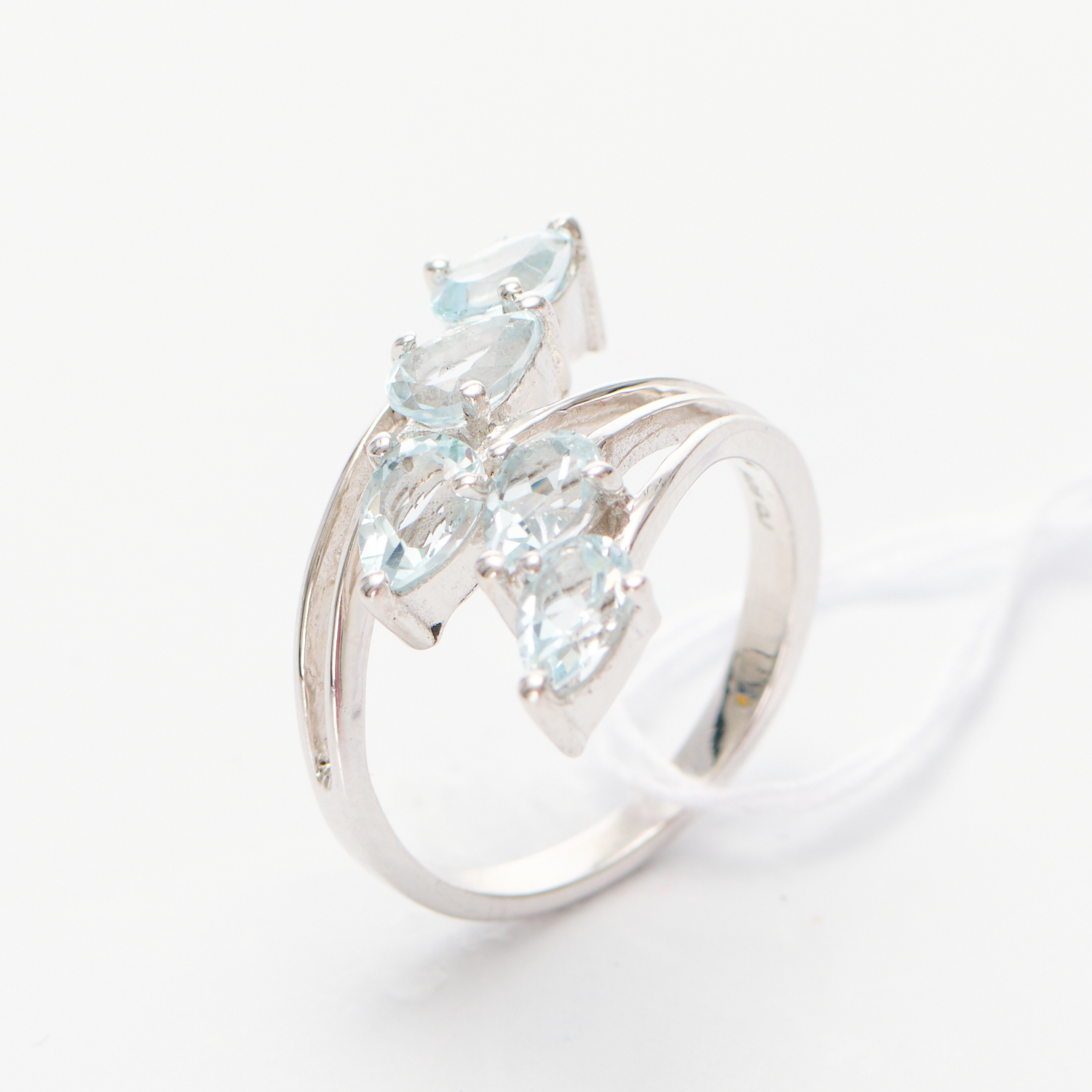 A PEAR CUT AQUAMARINE CROSS OVER RING IN SILVER, SIZE N
