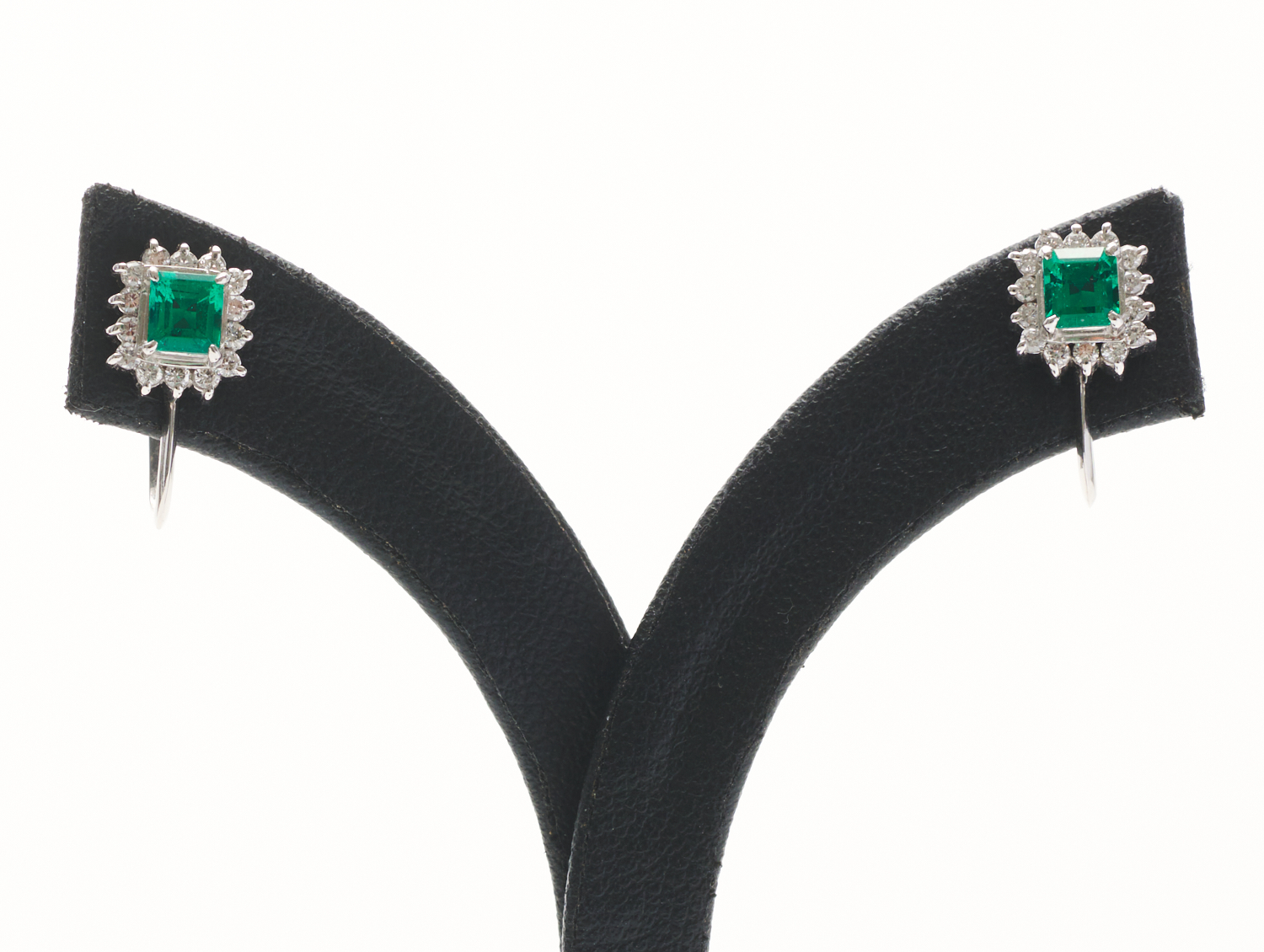 A PAIR OF EMERALD AND DIAMOND EARRINGS IN PLATINUM, TO SCREW BACK FITTINGS