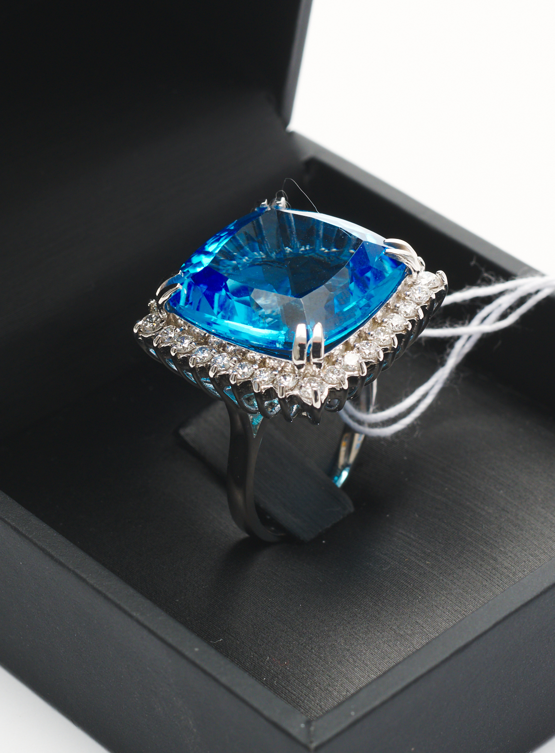A TOPAZ AND DIAMOND RING IN 14CT WHITE GOLD, THE CUSHION CUT TOPAZ WEIGHING 27.94CTS, SIZE N, 12.7GMS