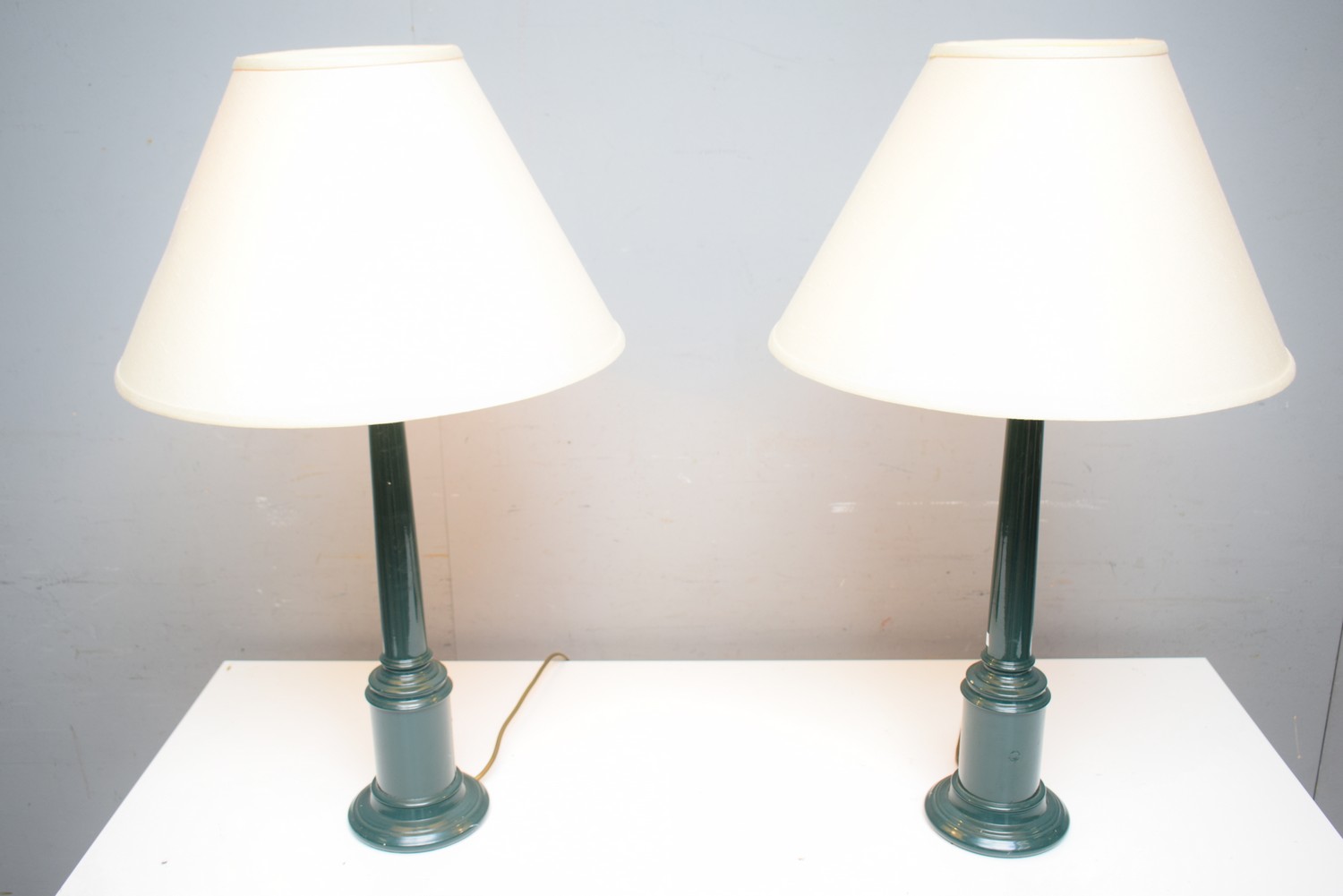 A PAIR OF GREEN TIMBER TABLE LAMPS (H73 X D45 CM) (LEONARD JOEL DELIVERY SIZE: SMALL)