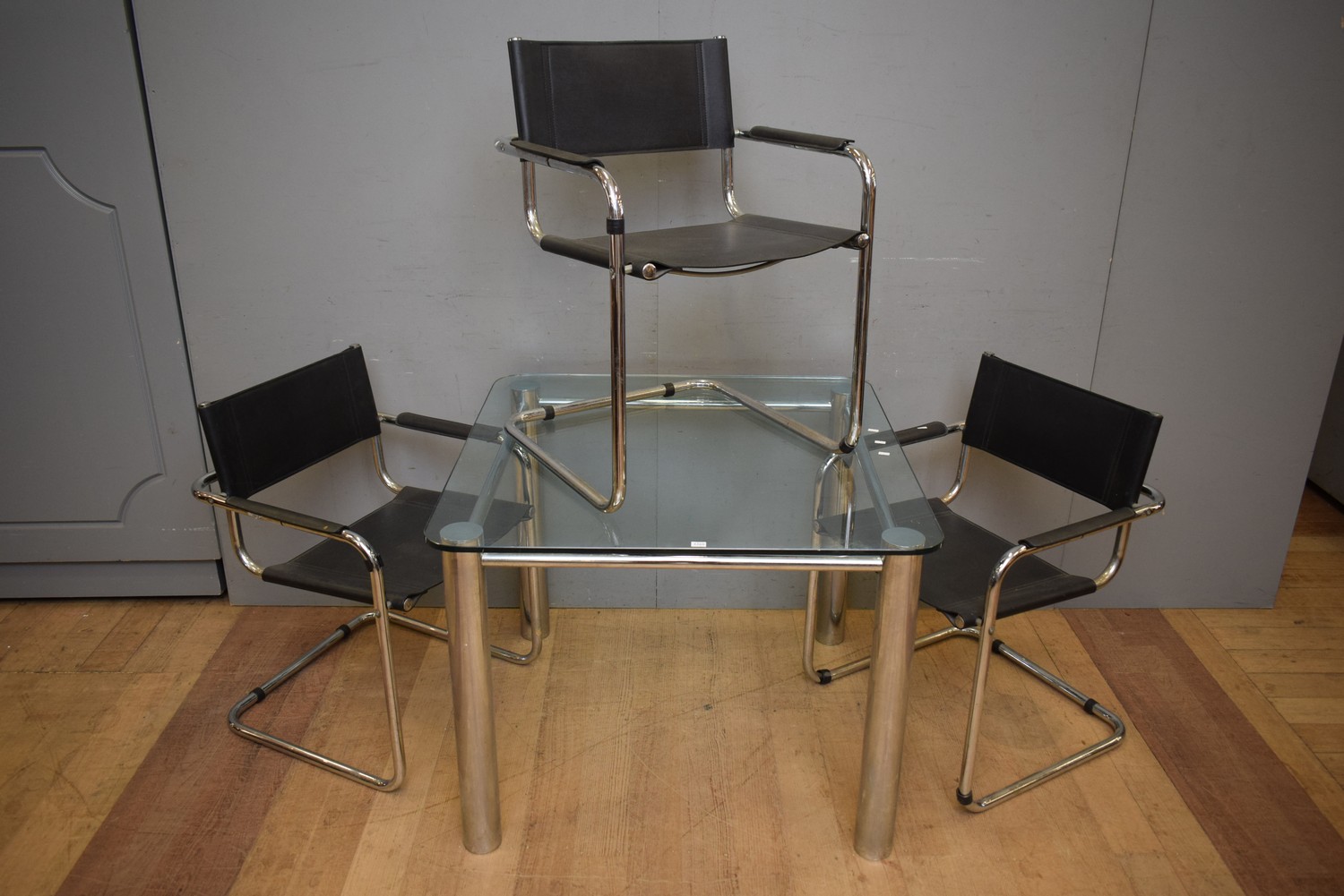 AN ITALIAN CHROME AND GLASS TABLE WITH CHAIRS (A/F) (70H x 91W x 91D CM) (PLEASE NOTE THIS HEAVY ITEM MUST BE REMOVED BY CARRIERS AT THE CUSTOMER'S EXPENSE. LEONARD JOEL STAFF CANNOT ASSIST CARRYING THIS ITEM) (X-LARGE ITEM)