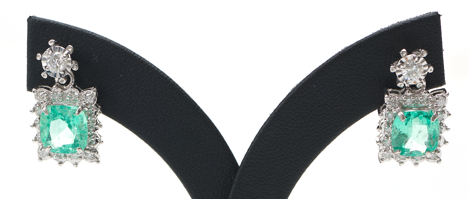 A PAIR OF COLUMBIAN EMERALD AND DIAMOND EARRINGS, TOTAL EMERALD WEIGHT 4.90cts, TORAL DIAMONMF WEIGHT 0.40cts AND 0.50cts, IN 18CT GOLD.