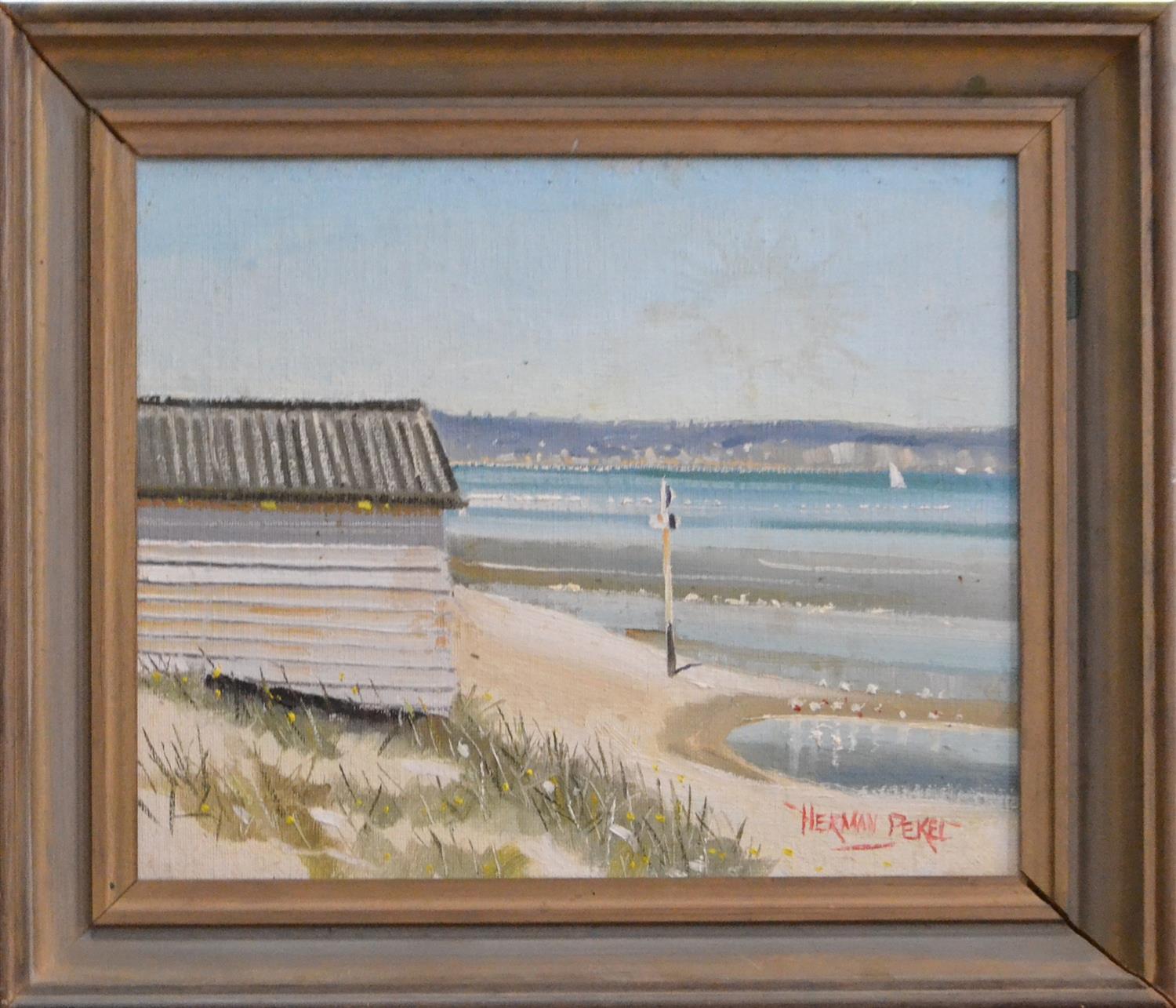 HERMAN PEKEL, BATHING BOX, OIL ON CANVASBOARD, 34 X 29CM, FRAME SIZE: 35 X 40CM, CONDITION: GOOD, WITH ONE STAIN OF NOTE IN UPPER RIGHT SECTION, APPROX. 5 X 5CM. LEONARD JOEL DELIVERY SIZE: MEDIUM