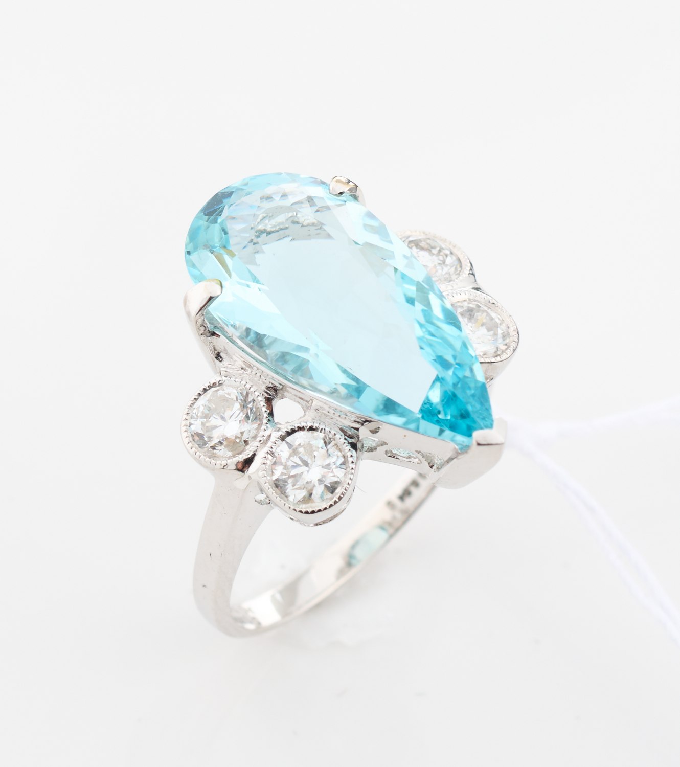 AN AQUAMARINE AND DIAMOND RING, FEATURING A PEAR CUT AQUAMARINE OF 6.33CTS, FLANKED BY TWO ROUND BRILLIANT CUT DIAMONDS TOTALLING 1.0CT, IN 18CT WHITE GOLD, RING SIZE P