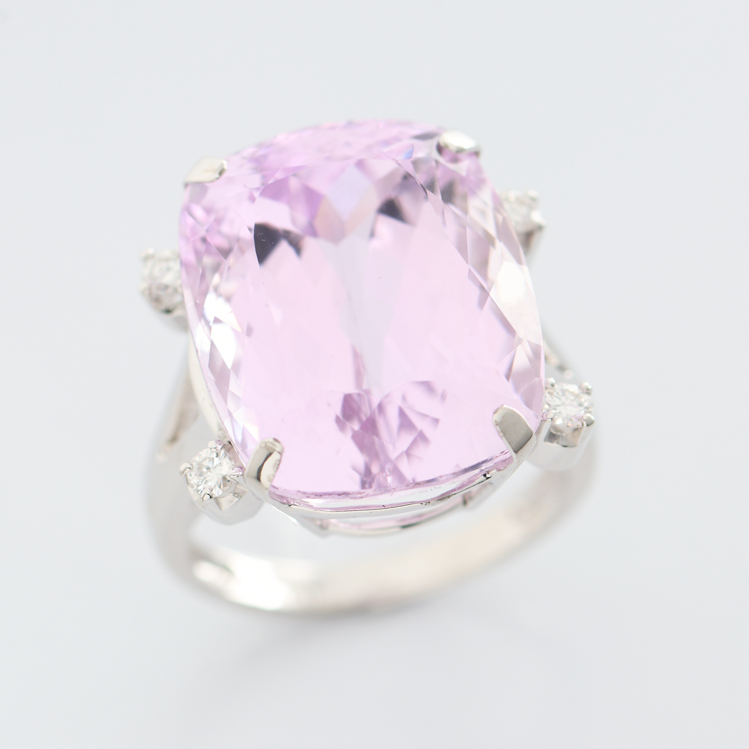 A KUNZITE AND DIAMOND DRESS RING IN 18CT WHITE GOLD, CENTRALLY SET WITH A KUNZITE WEIGHING 25.20CTS AND DIAMONDS TOTALLING 0.16CTS, RING SIZE