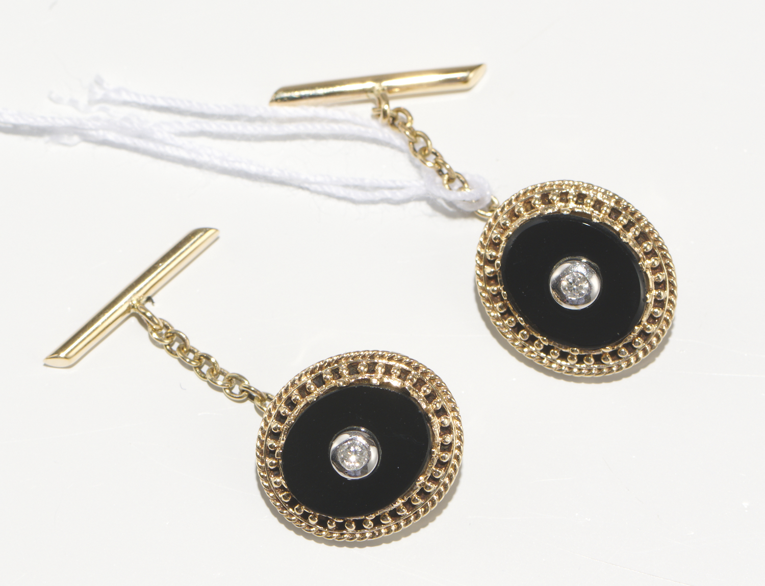 A PAIR OF ONYX AND DIAMOND CUFFLINKS IN 9CT GOLD, DIAMONDS WEIGHING 0.07CT, 3.80GMS