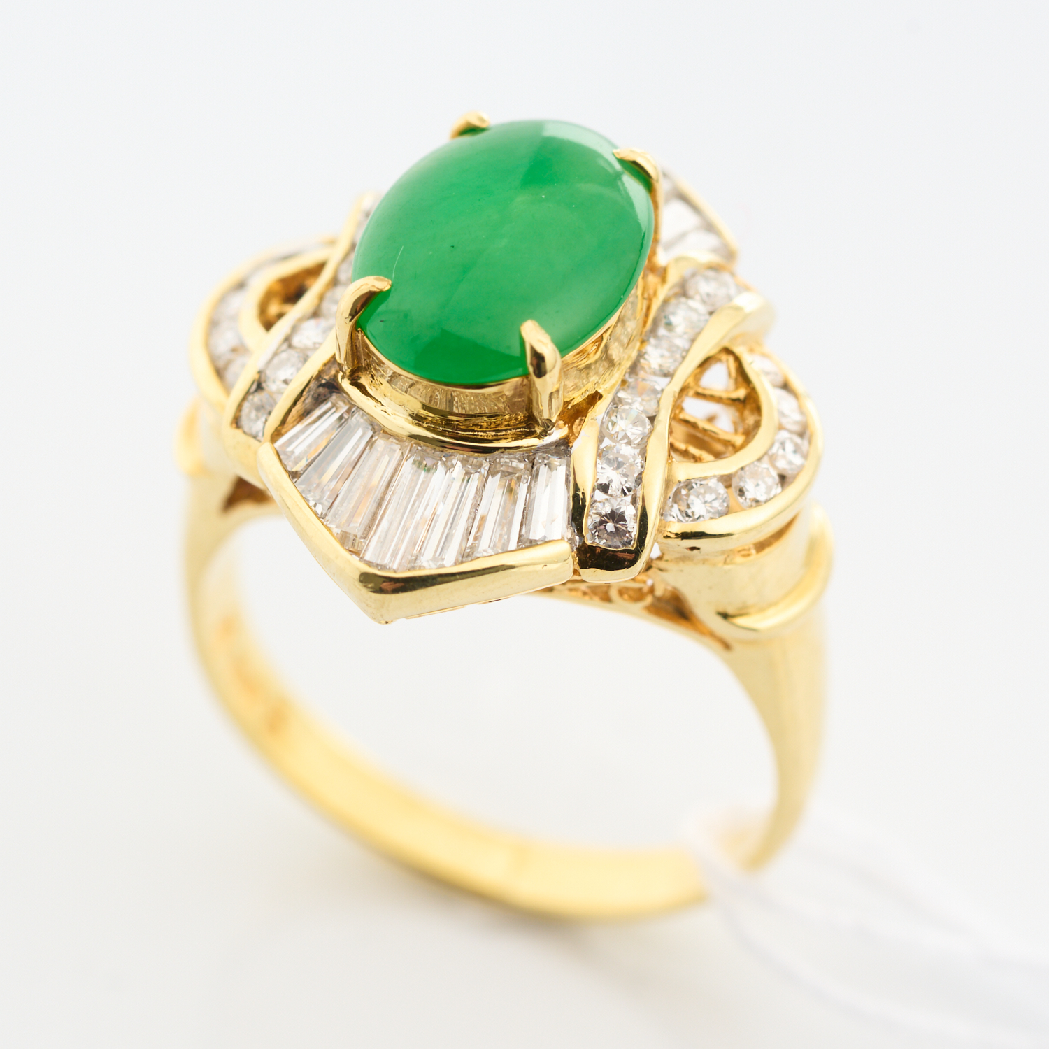 A JADEITE AND DIAMOND RING IN 18CT GOLD, RING SIZE L, 6.3GMS