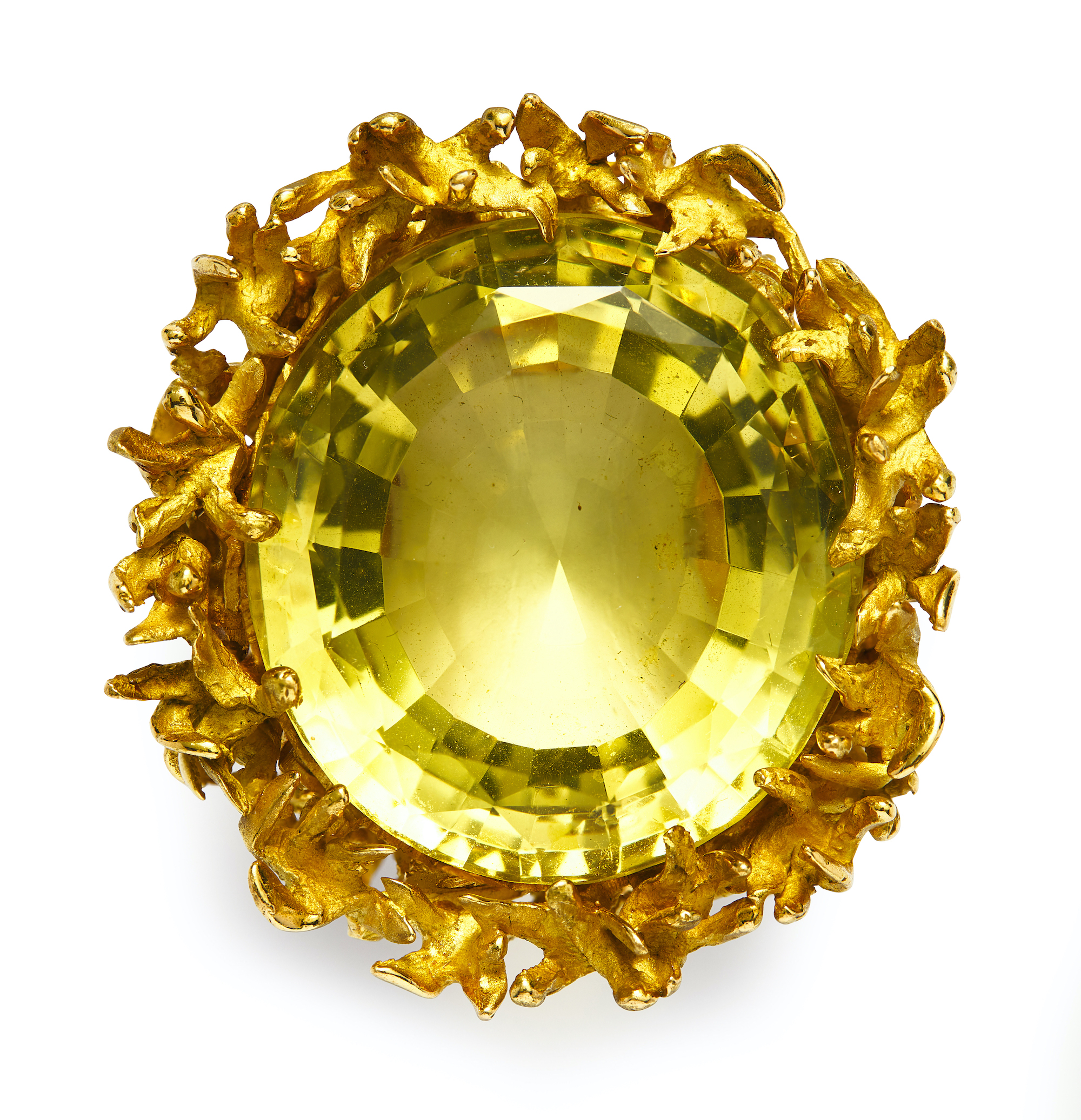 Centring a claw-set oval lemon quartz measuring approximately 34mm x 31mm supported from an openwork gallery modelled as branches of sea coral to a half hoop of continuous bark design, the lemon quartz weighing approximately 130 carats, gross weight 96 grams, size O1/2.