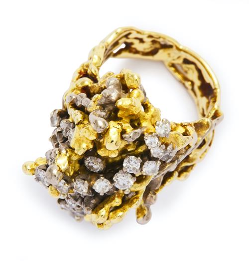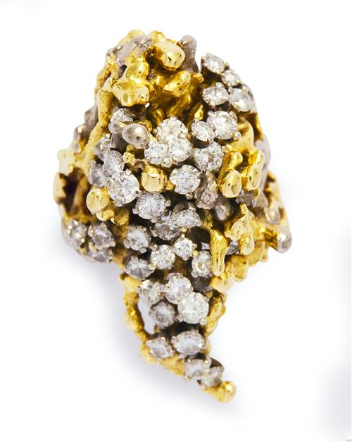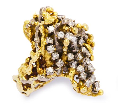 Of organic form, the openwork textured mount decorated at intervals with claw-set brilliant-cut diamonds together weighing approximately 2.20 carats, gross weight 38 grams, size O.