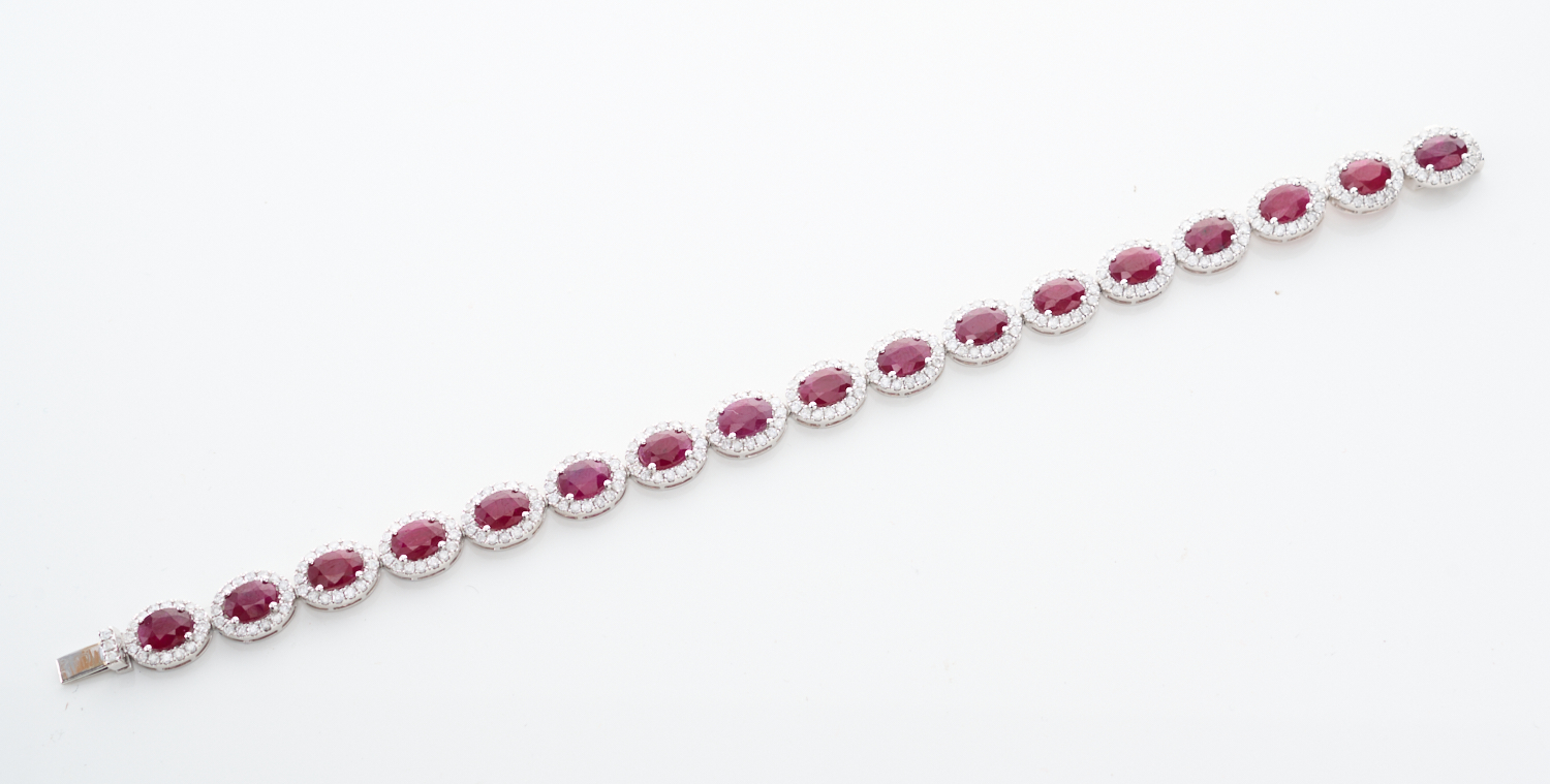 A RUBY AND DIAMOND BRACELET COMPRISING OVAL CUT TREATED RUBIES TOTALLING AN ESTIMATED 13.86CTS AND ROUND BRILLIANT CUT DIAMONDS, IN 18CT GOLD, LENGTH 183MM